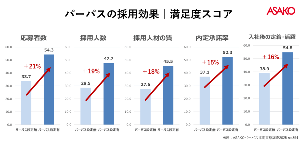 A. パーパス設定企業は応募数、定着率、内定承諾率などほぼ全指標で+15~21Pt改善の定量・定性効果が実証されています。