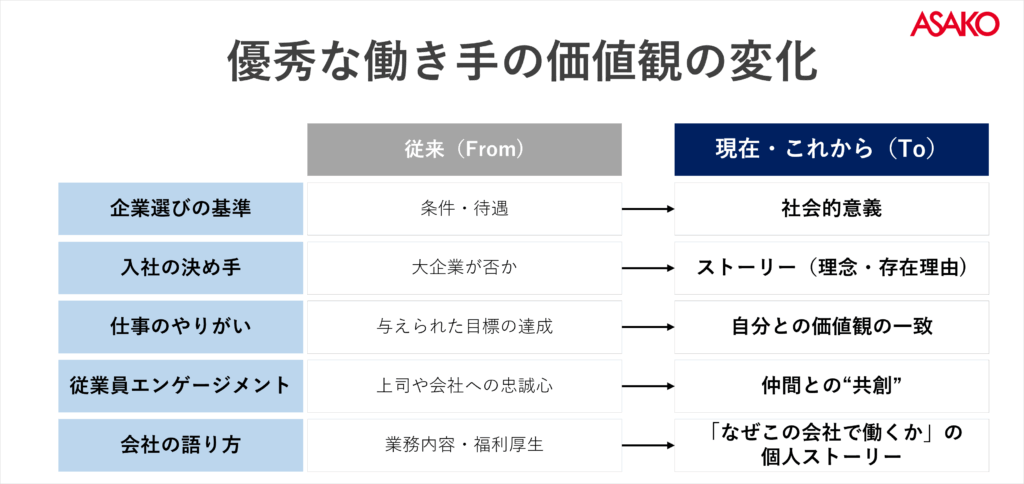 - 優秀な人材は、キャリア成長や社会貢献性などの「物語性」を重視する。