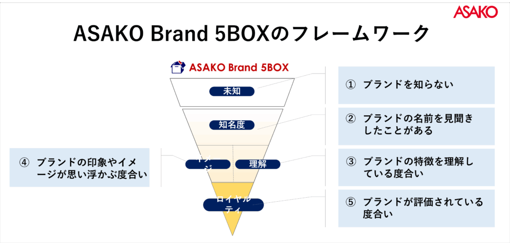 ASAKO Brand 5BOXは数百~数千人規模の調査データを基に「認知・理解・イメージ・購入意向・競合比較」の5視点で診断するソリューションです。
