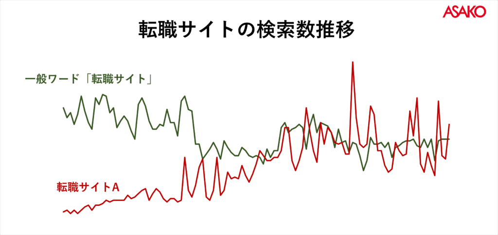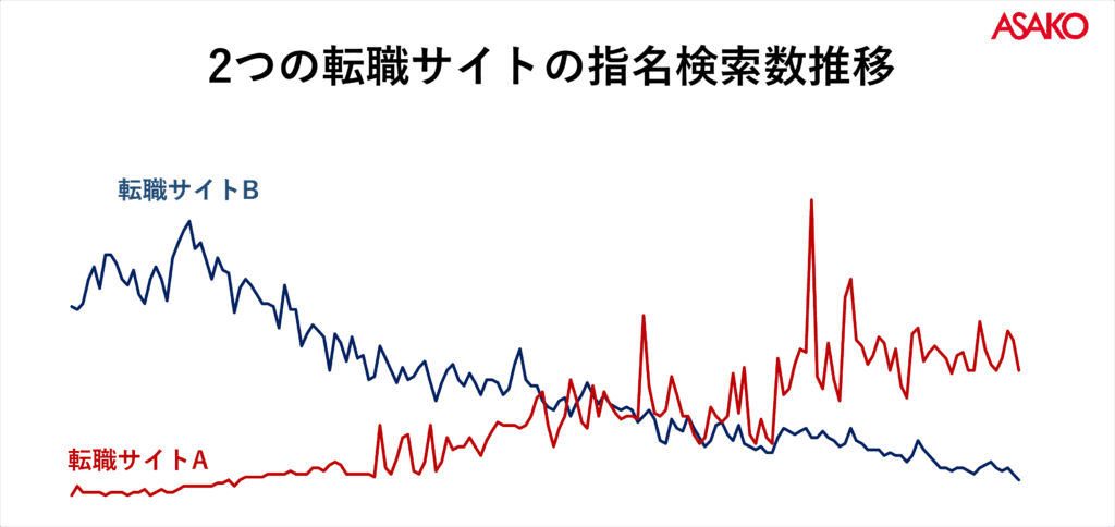 グラフを見ると、ある時期から「転職サイトA(赤)」が「転職サイトB(青)」の指名検索数を上回り始めたことがわかります。
