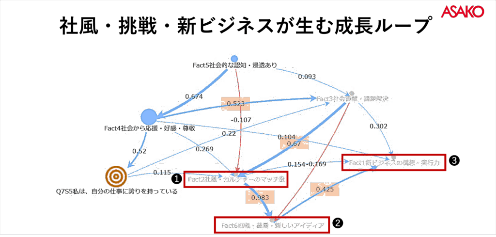 コーザル分析から明らかになったのは、社風マッチ度 → 挑戦機会(0.983) → 新ビジネス構想力(0.425)という、誇りと事業成長をつなぐ強力な連鎖です。