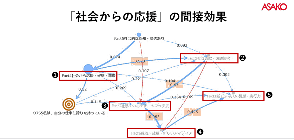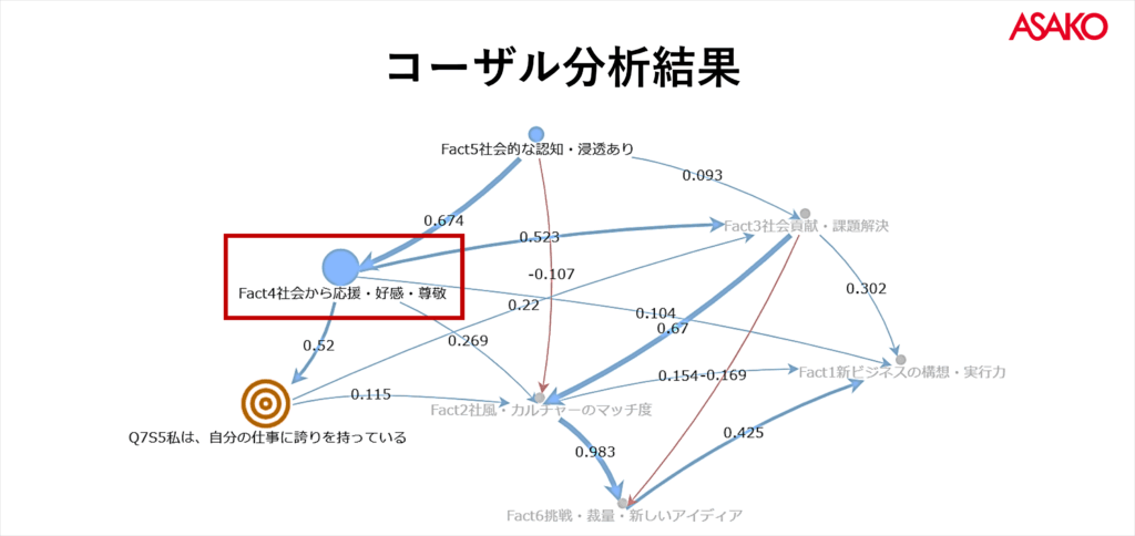 A3. コーザル分析は要素間の因果関係を検証する手法で、社員の誇りに対し「社会からの応援・好感・尊敬」が最大の影響を持つことが明らかになっています。
