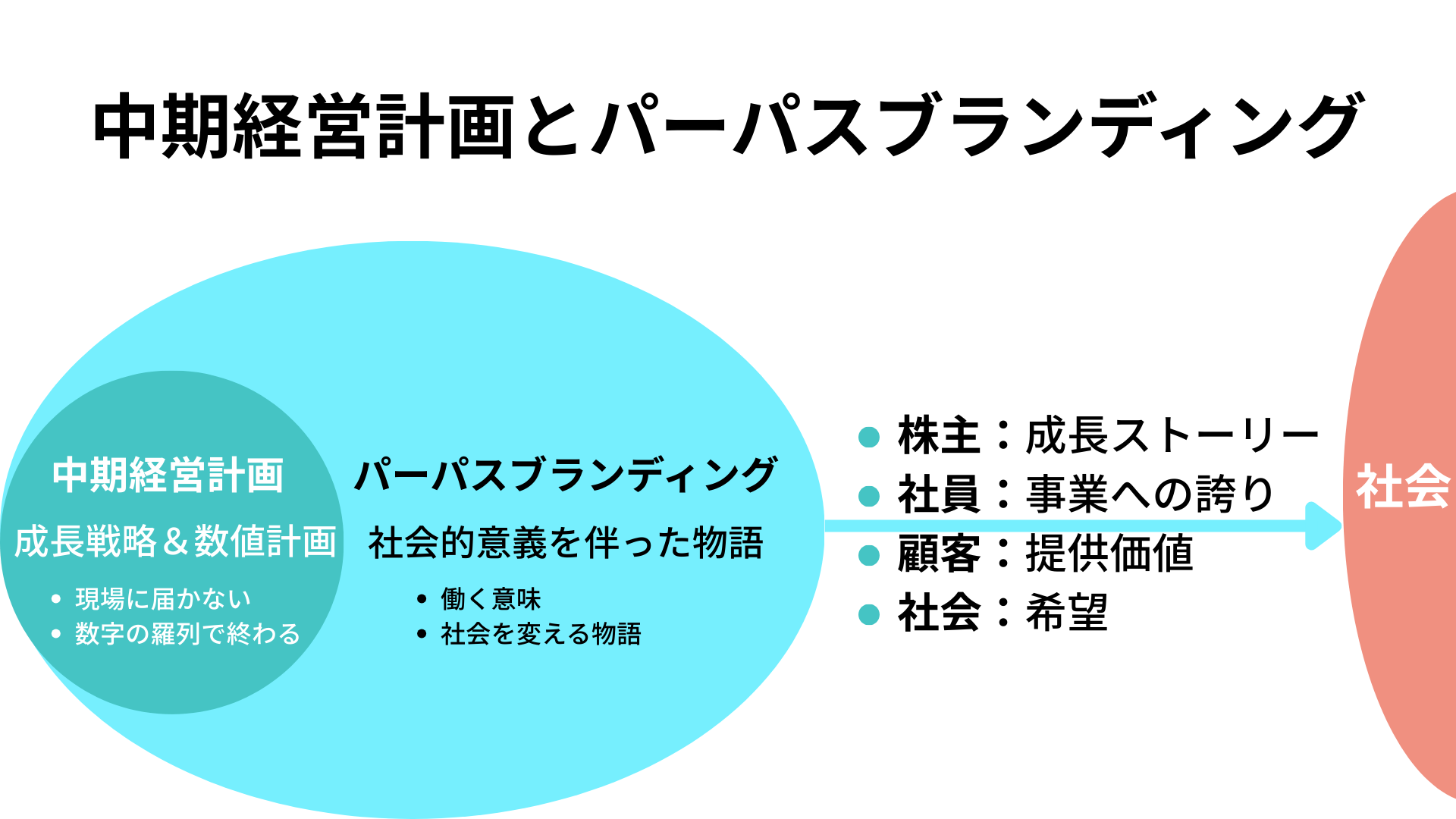 言い換えれば、パーパスブランディングは中期経営計画に “感情移入を宿すプロセス” です。