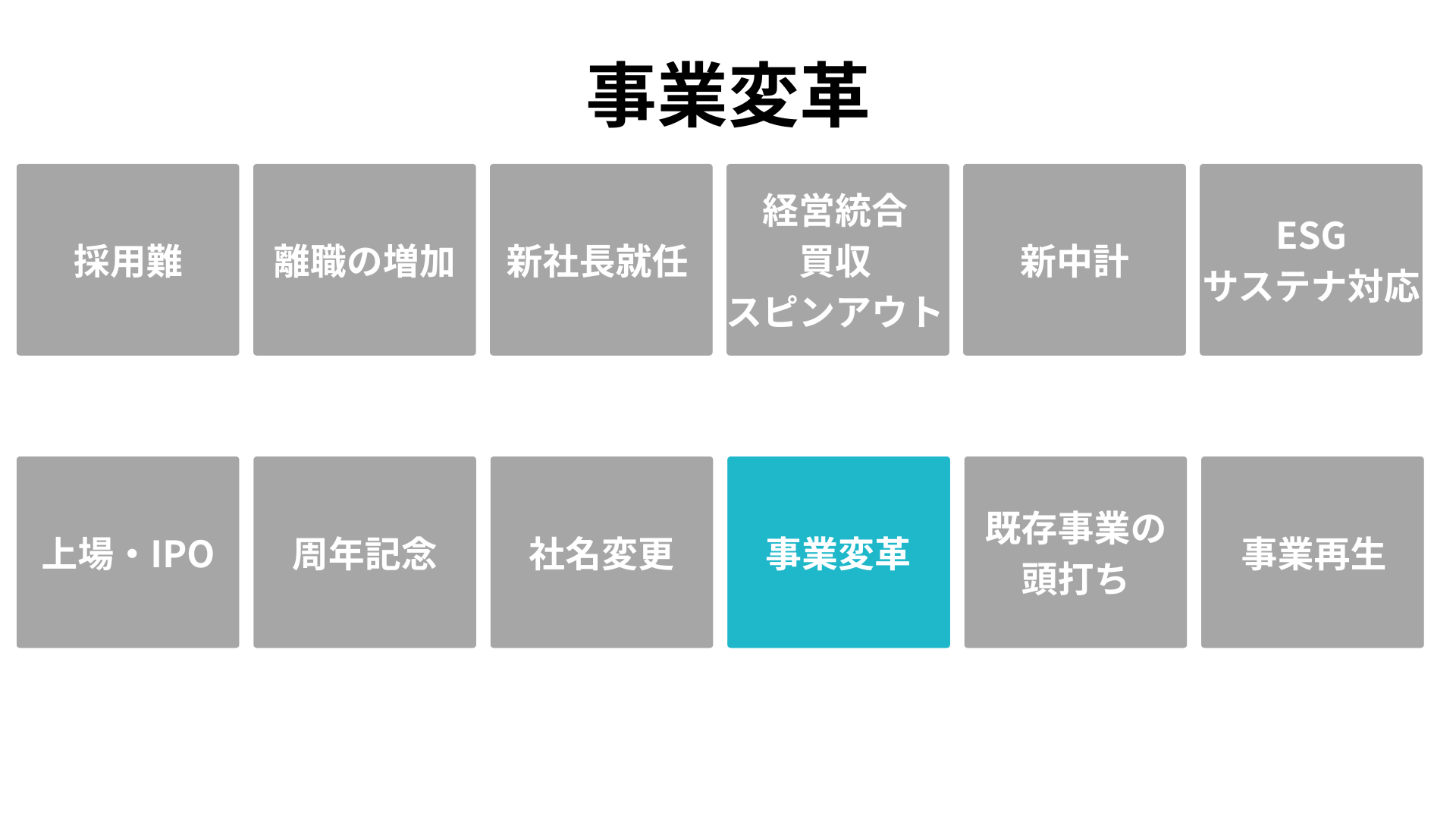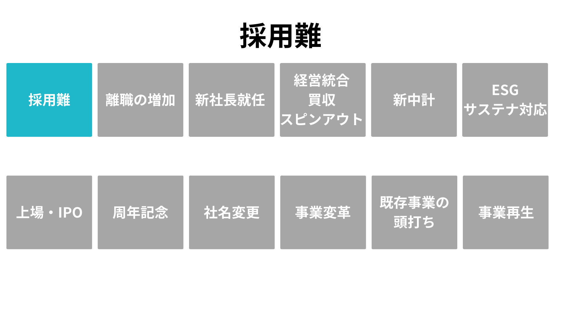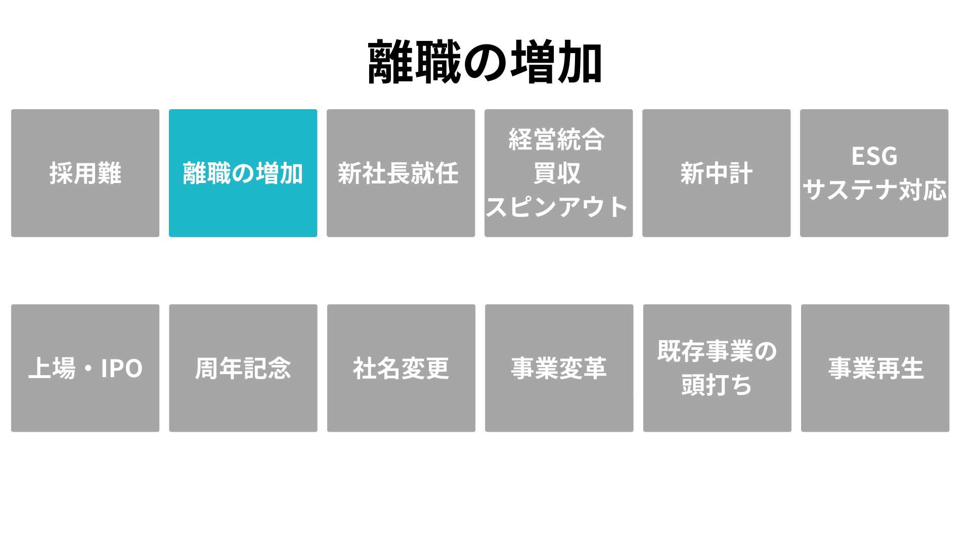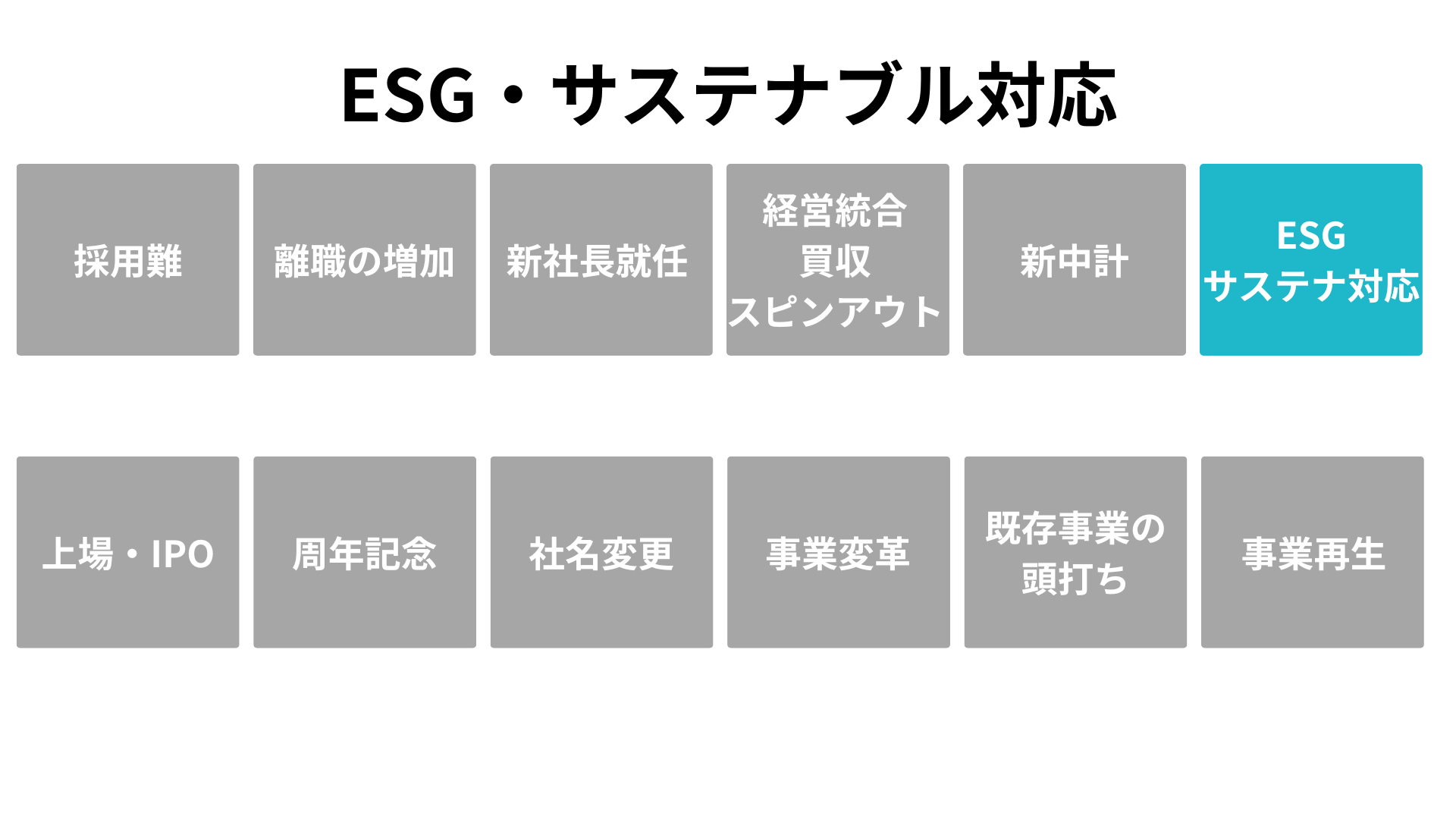 「いまこそ着手すべき根拠」を、企業が直面する 12の転機(採用難、離職増、新社長就任、経営統合、中期経営計画、ESG対応、IPO、周年、社名変更、事業変革、既存事業の頭打ち、事業再生)として明文化します。