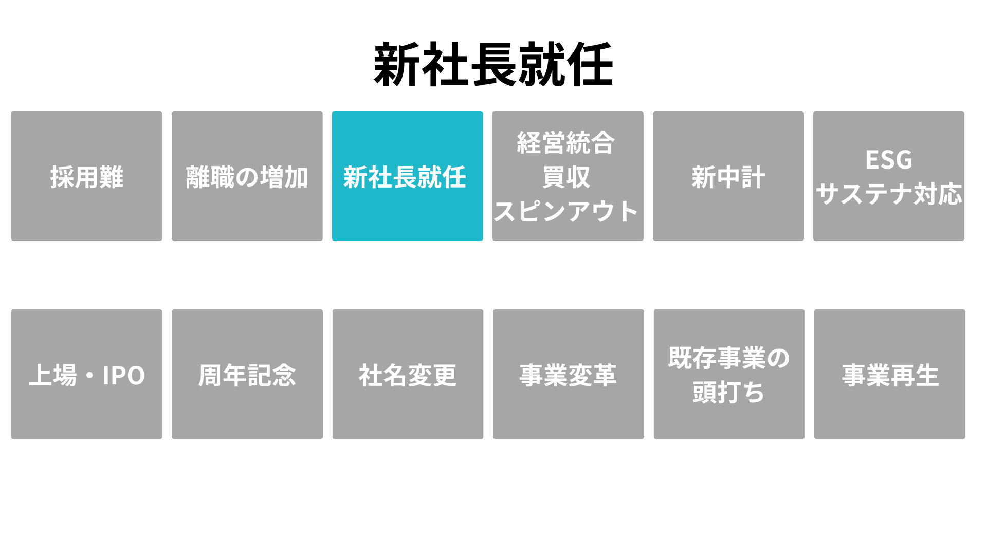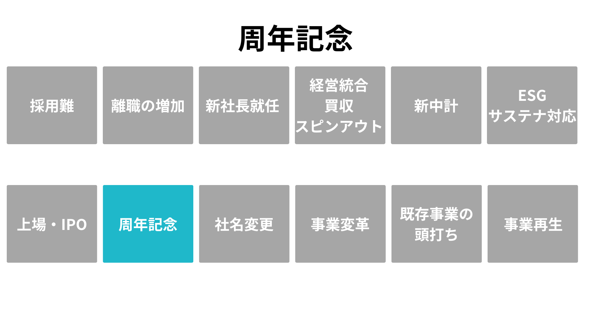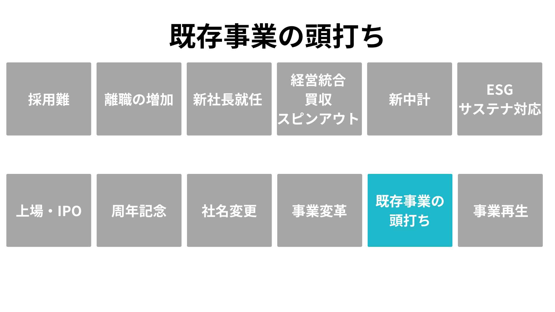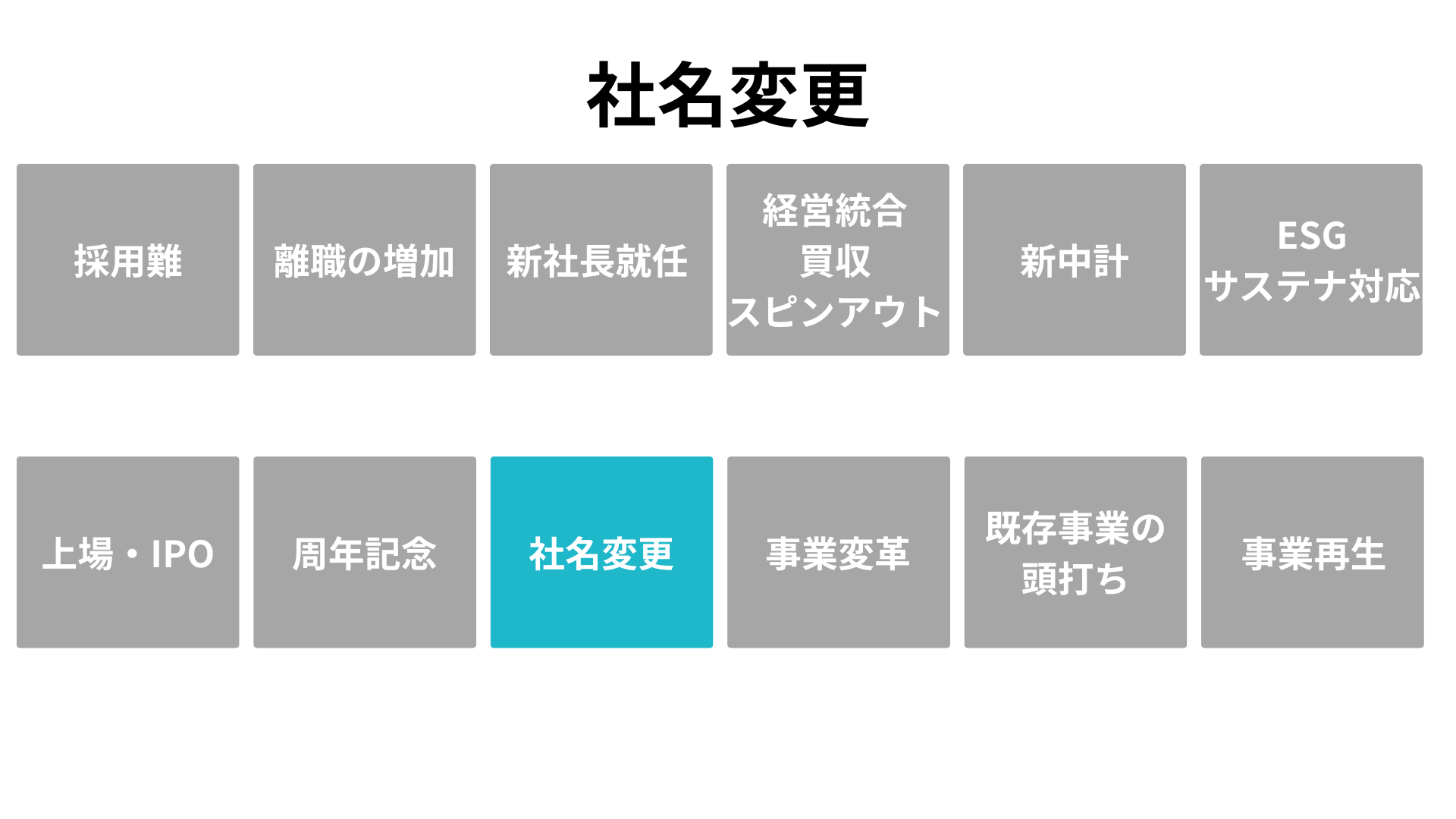「いまこそ着手すべき根拠」を、企業が直面する 12の転機(採用難、離職増、新社長就任、経営統合、中期経営計画、ESG対応、IPO、周年、社名変更、事業変革、既存事業の頭打ち、事業再生)として明文化します。