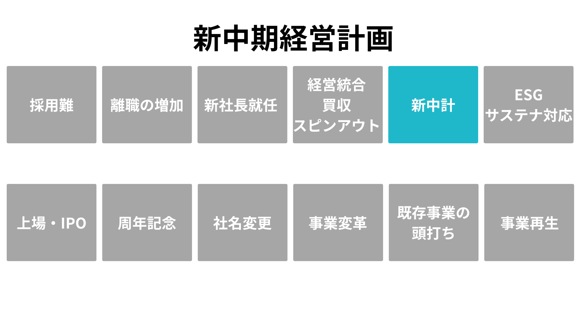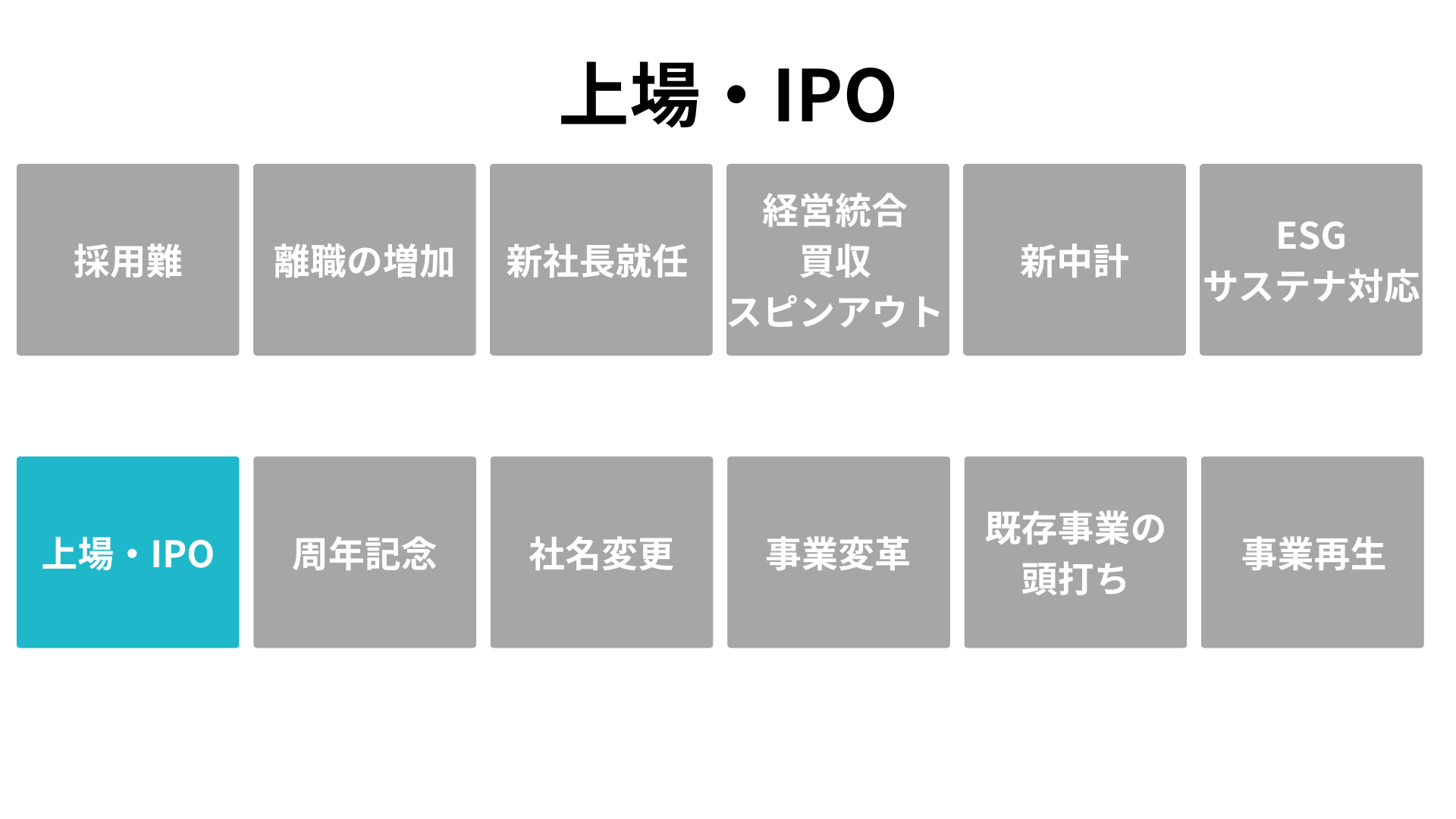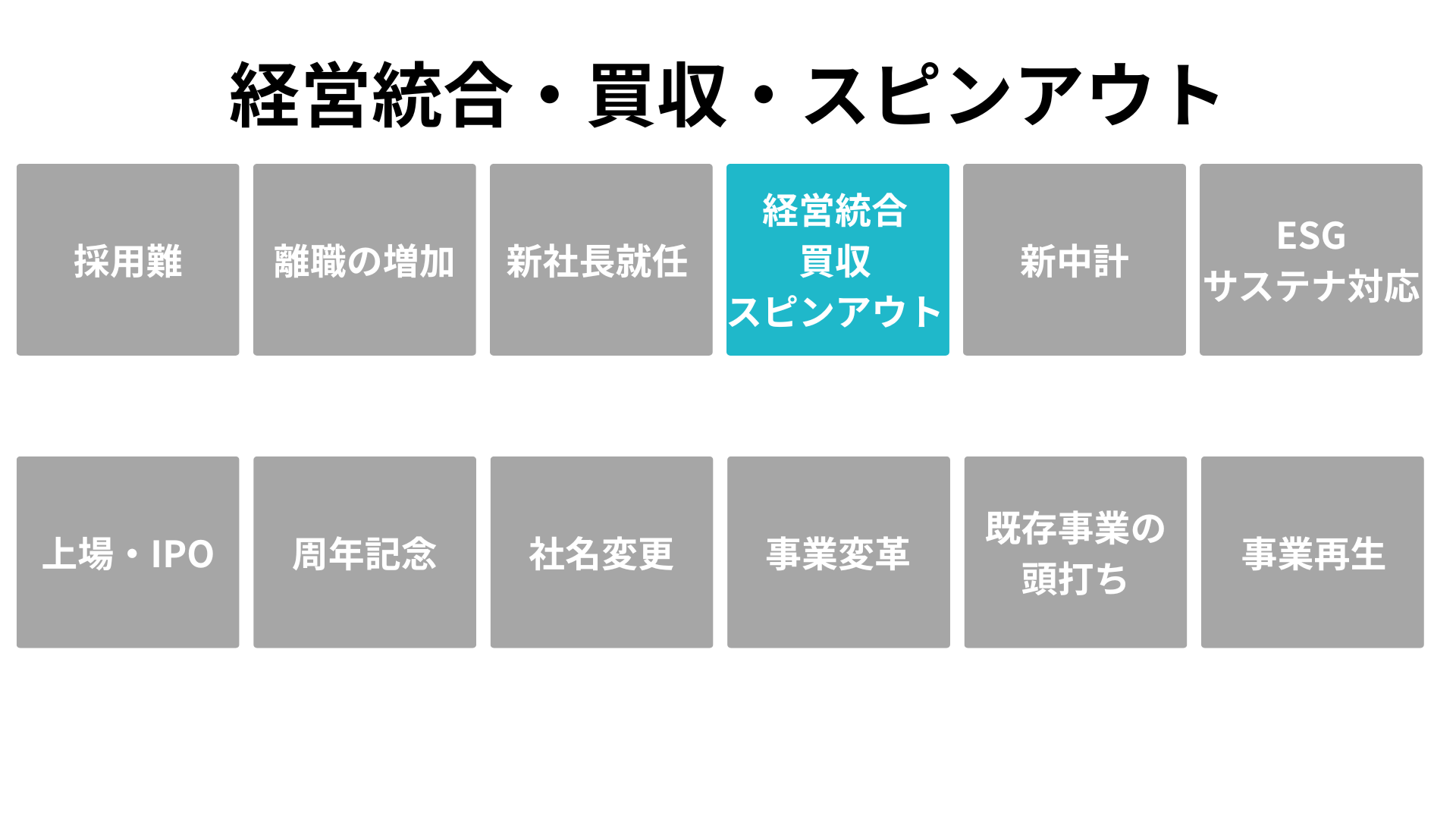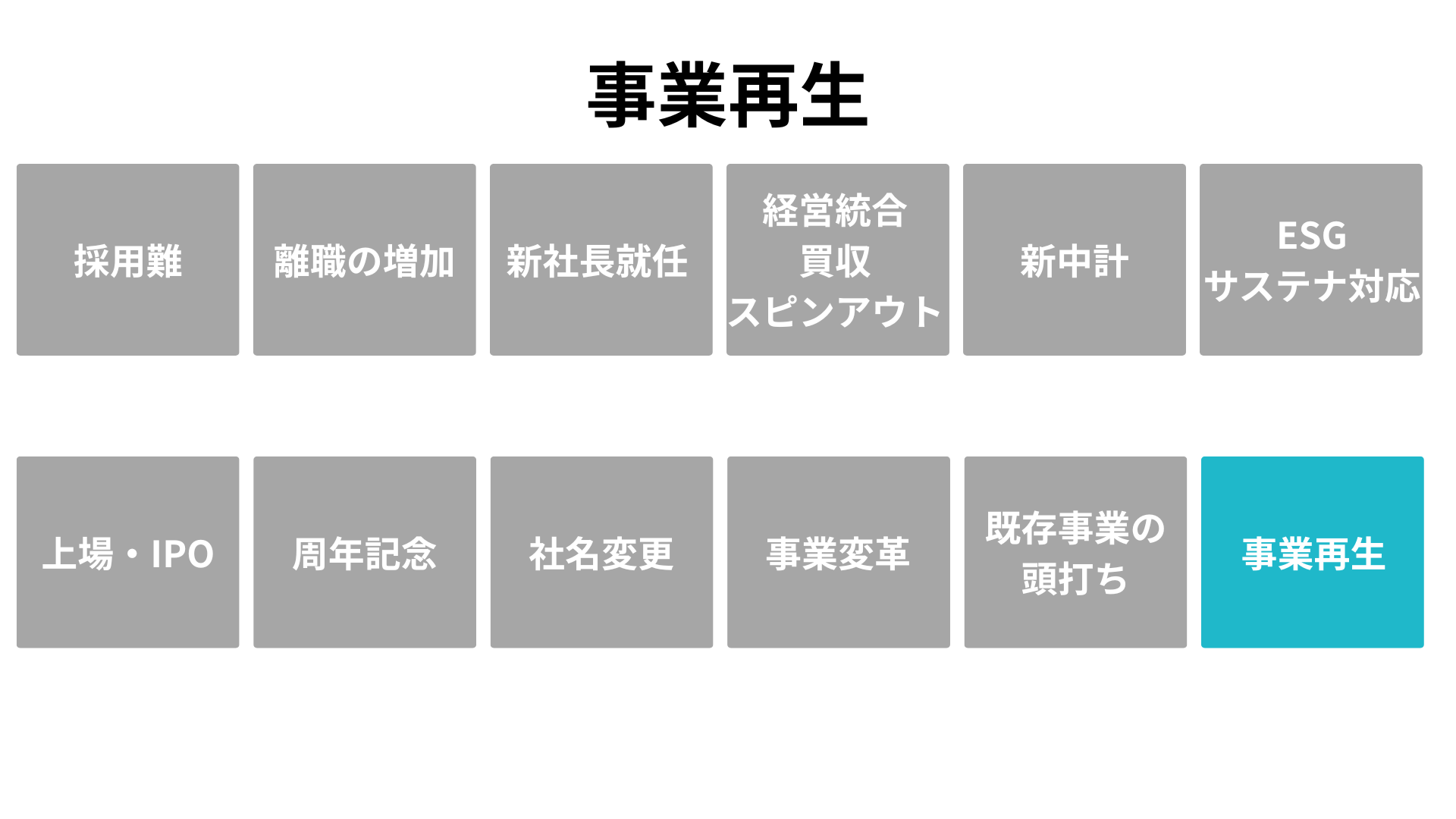 「いまこそ着手すべき根拠」を、企業が直面する 12の転機(採用難、離職増、新社長就任、経営統合、中期経営計画、ESG対応、IPO、周年、社名変更、事業変革、既存事業の頭打ち、事業再生)として明文化します。