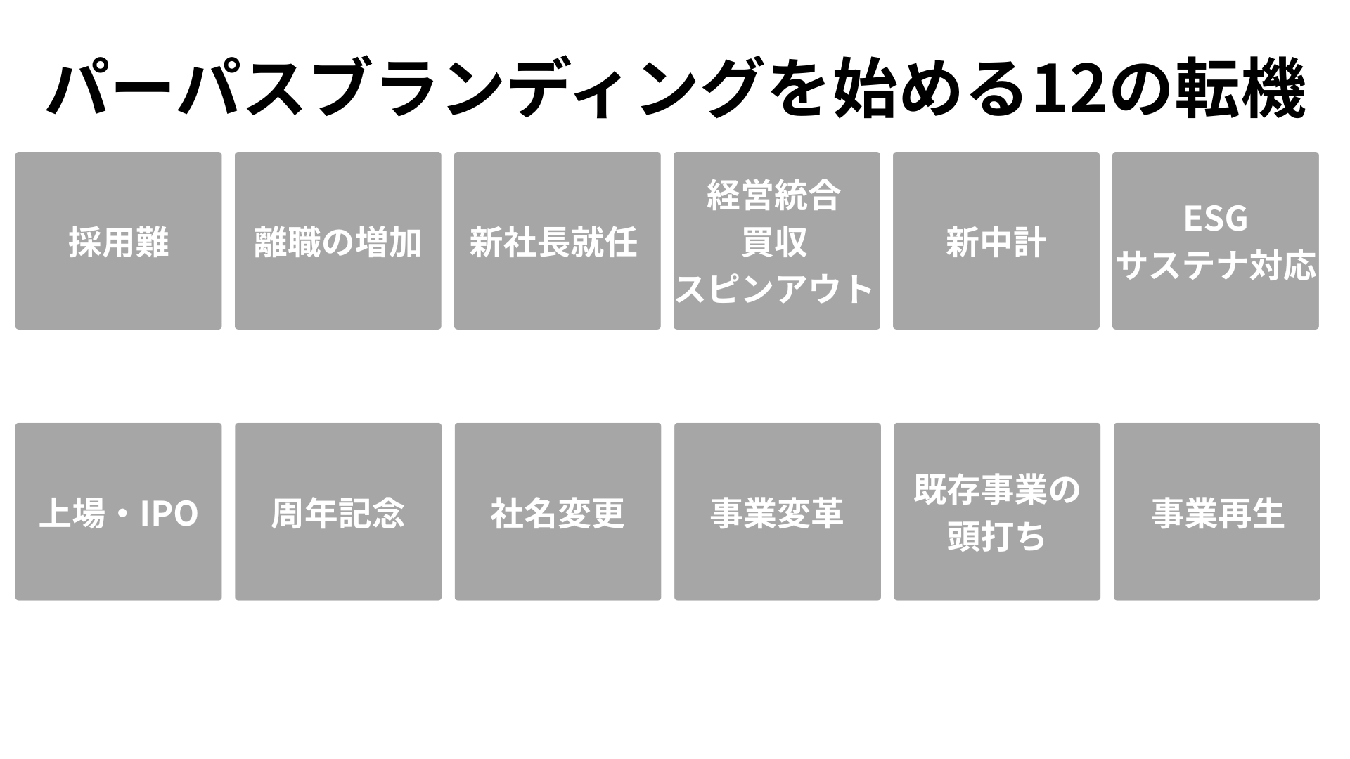 採用難、離職増、新社長就任、M&A、新中計、ESG対応、IPO、周年など12の転機は、存在価値を問い直し社内外の共鳴を高める絶好の機会です。