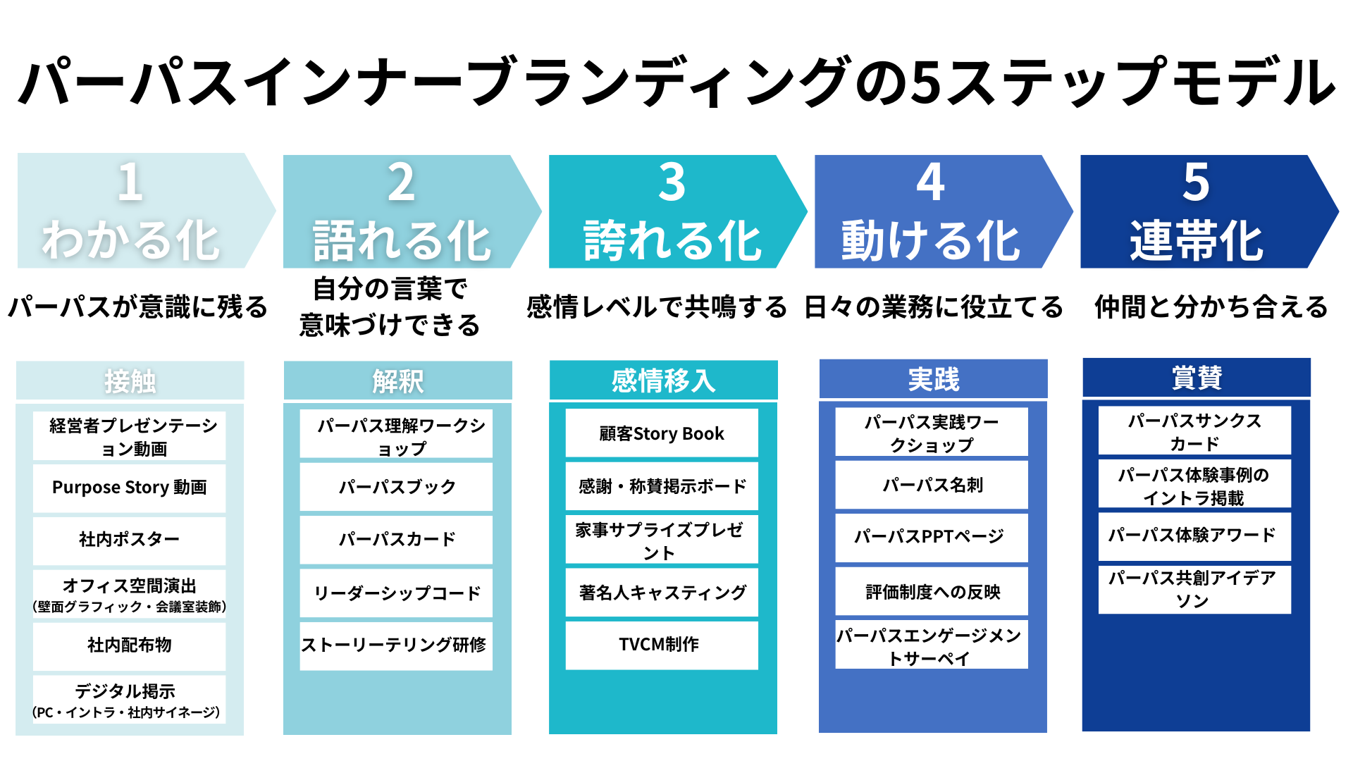 企業理念を「わかる化」「語れる化」「誇れる化」「動ける化」「連帯化」へと段階的に浸透させることで、初めて経営・採用・ブランド・社会的信頼をつなぐ推進力となります。