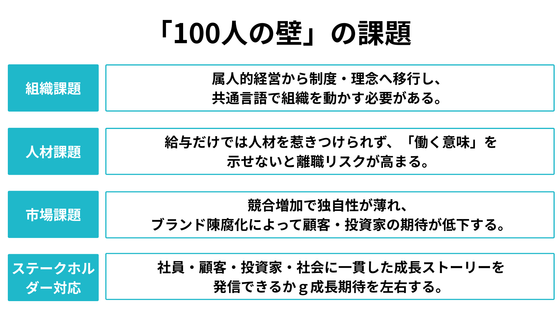 この壁は単なる社員数増加の問題だけではありません。組織の在り方、人材の多様化、カルチャーの維持、さらには市場での競争戦略まで──事業のあらゆる側面に影響を及ぼす転換点です。
