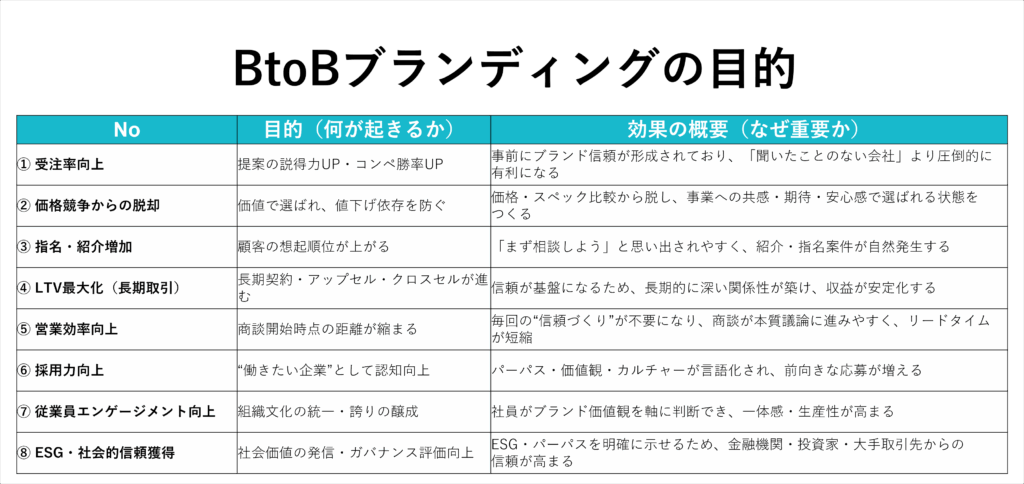 ④ BtoBブランディングの目的とは?|“選ばれ続ける企業”になる8つの効果