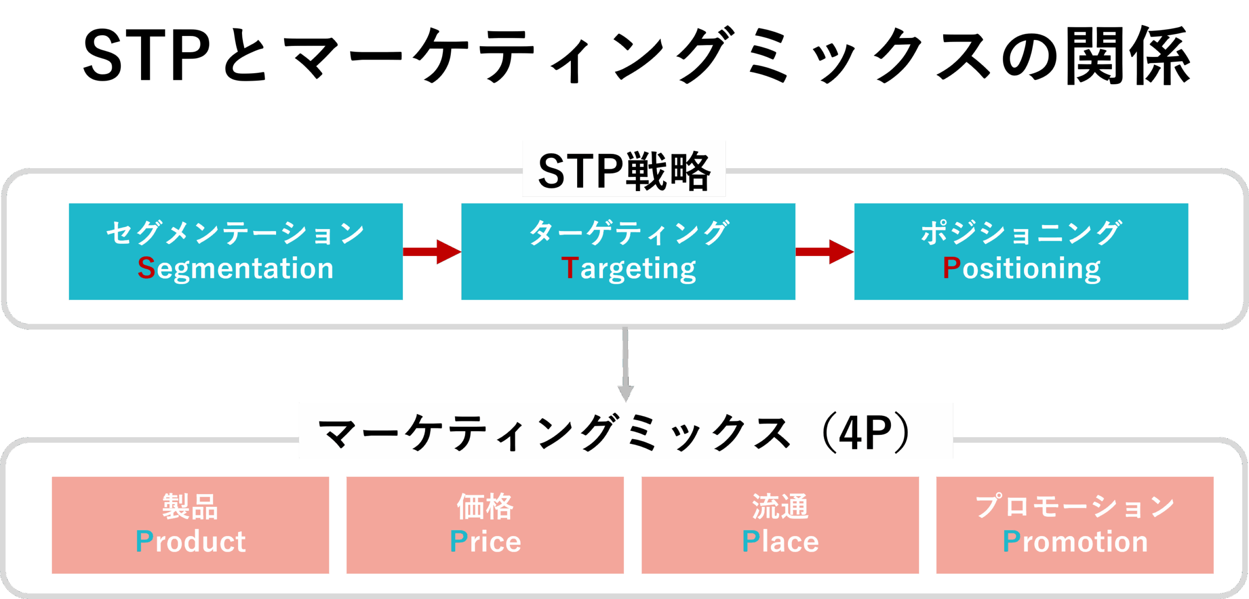 マーケティングミックスは、STP戦略(Segmentation/Targeting/Positioning)の後に位置づけられるフレームワークです。
