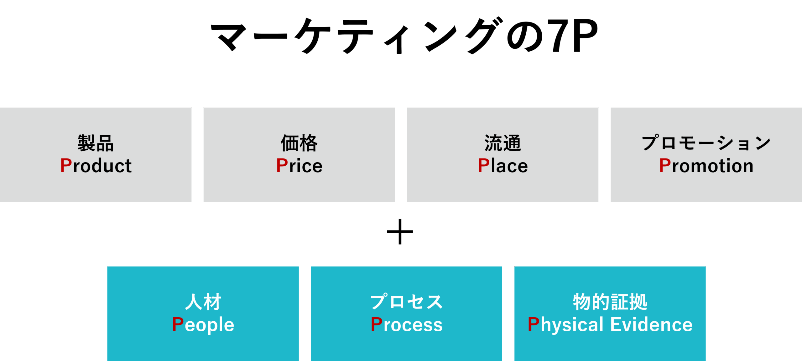 モノの販売を前提にした 4P ではカバーしきれない領域があるため、特にサービス業では 「7P」 という拡張フレームワークが活用されます。