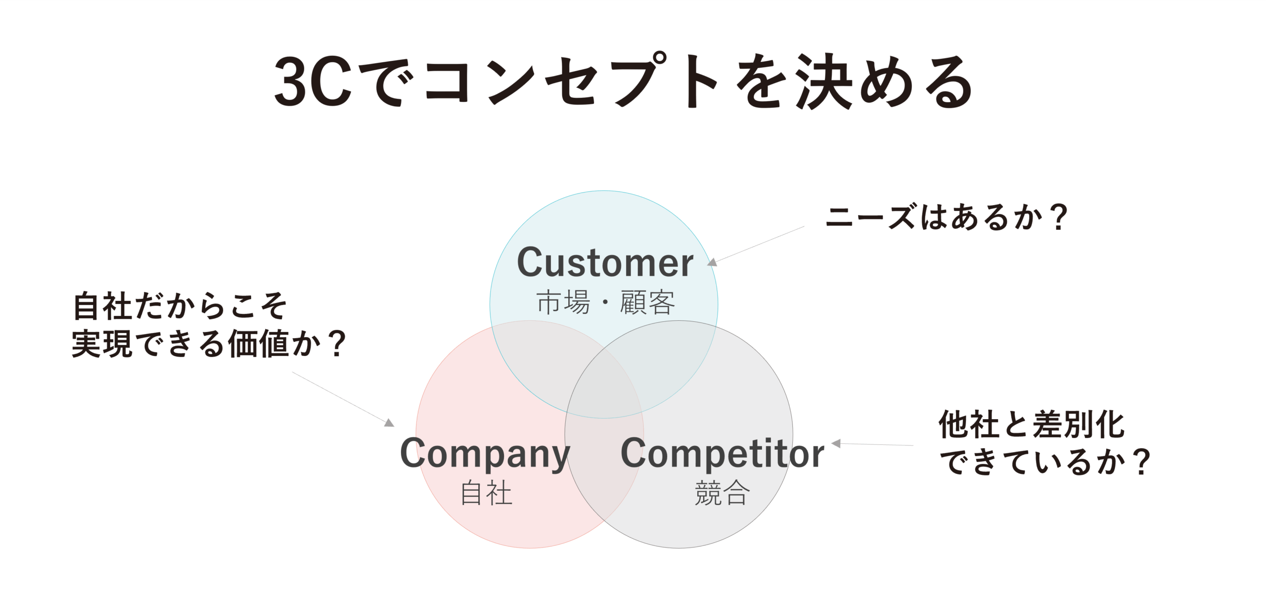 優れたコンセプトを決めるためには、マーケティングの基本原則である「3Cフレームワーク(Customer/Competitor/Company)」の視点を取り入れることが有効です。