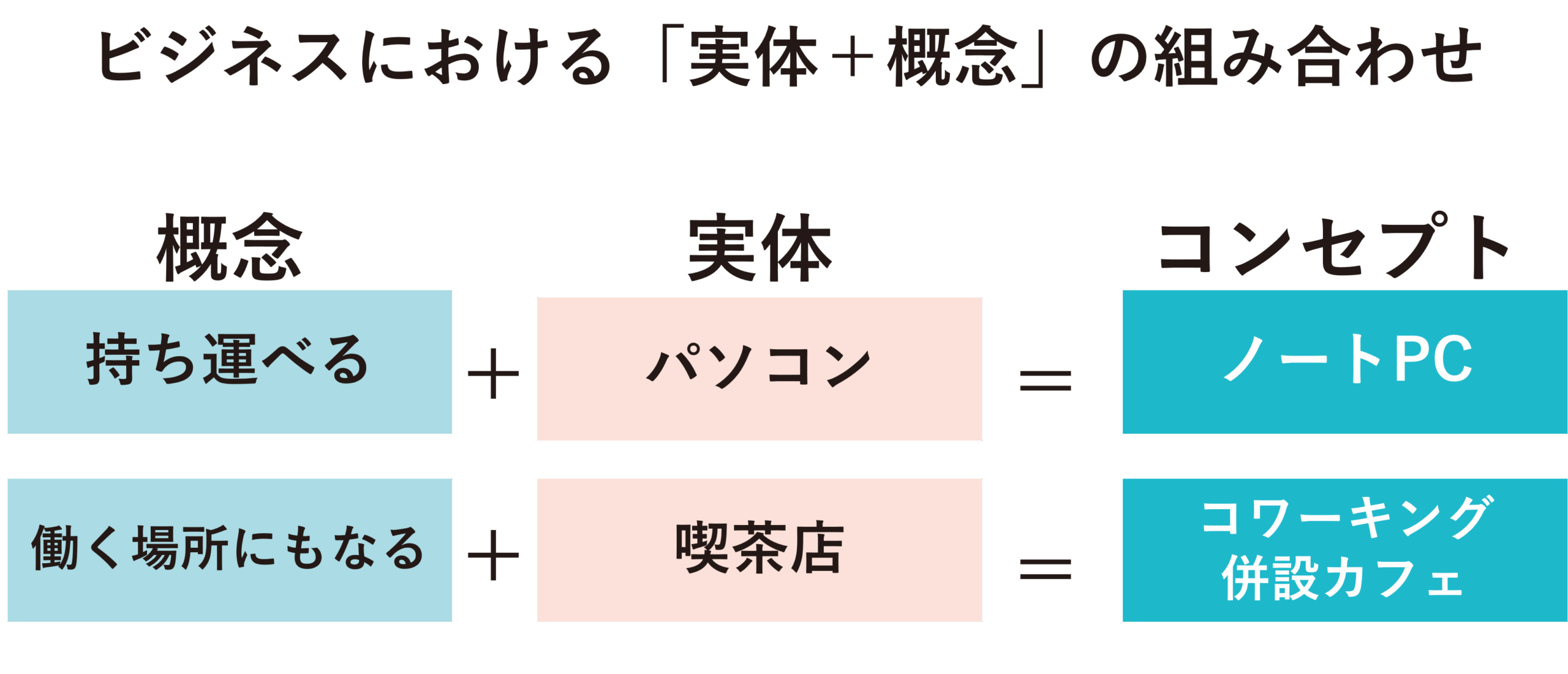 ここで、ぜひ覚えていただきたいのが、コンセプトとは「実体+概念」の組み合わせで作るものであることです。