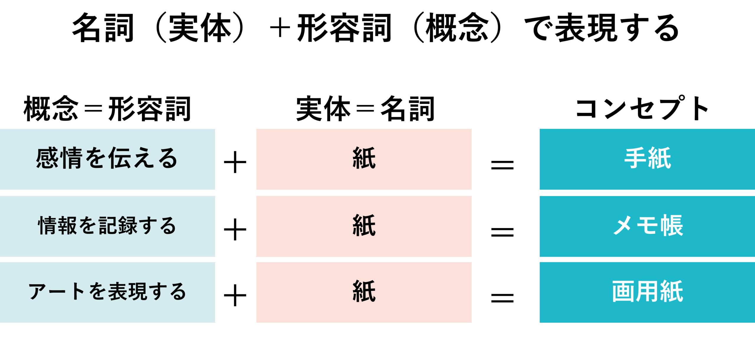 このとき難しく考える必要はありません。名詞(実体)に形容詞や形容句(概念)を加えるだけで、誰でも簡単にコンセプトが書けます。