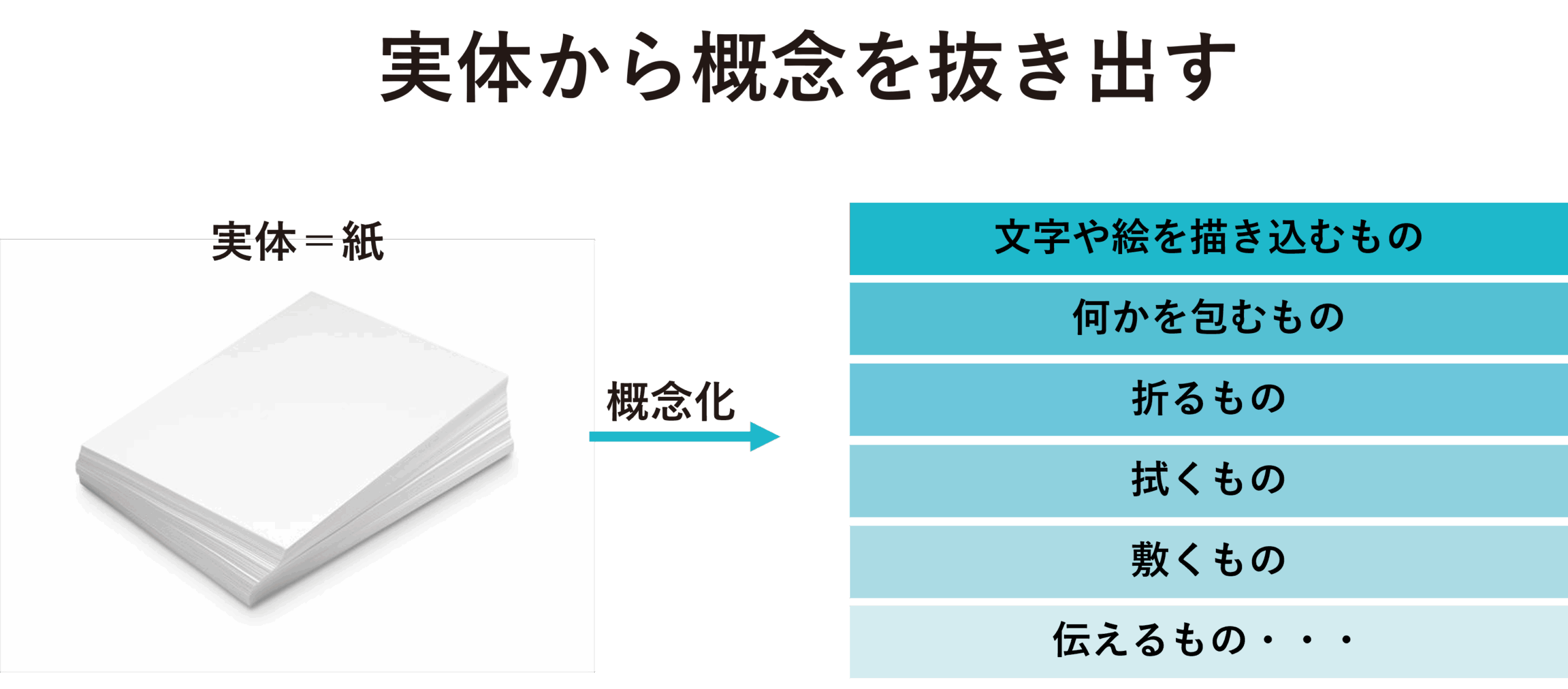 例えば「紙」という実体があったとします。そこから「書き込むもの」「包むもの」「折るもの」といった概念を取り出すことができます。