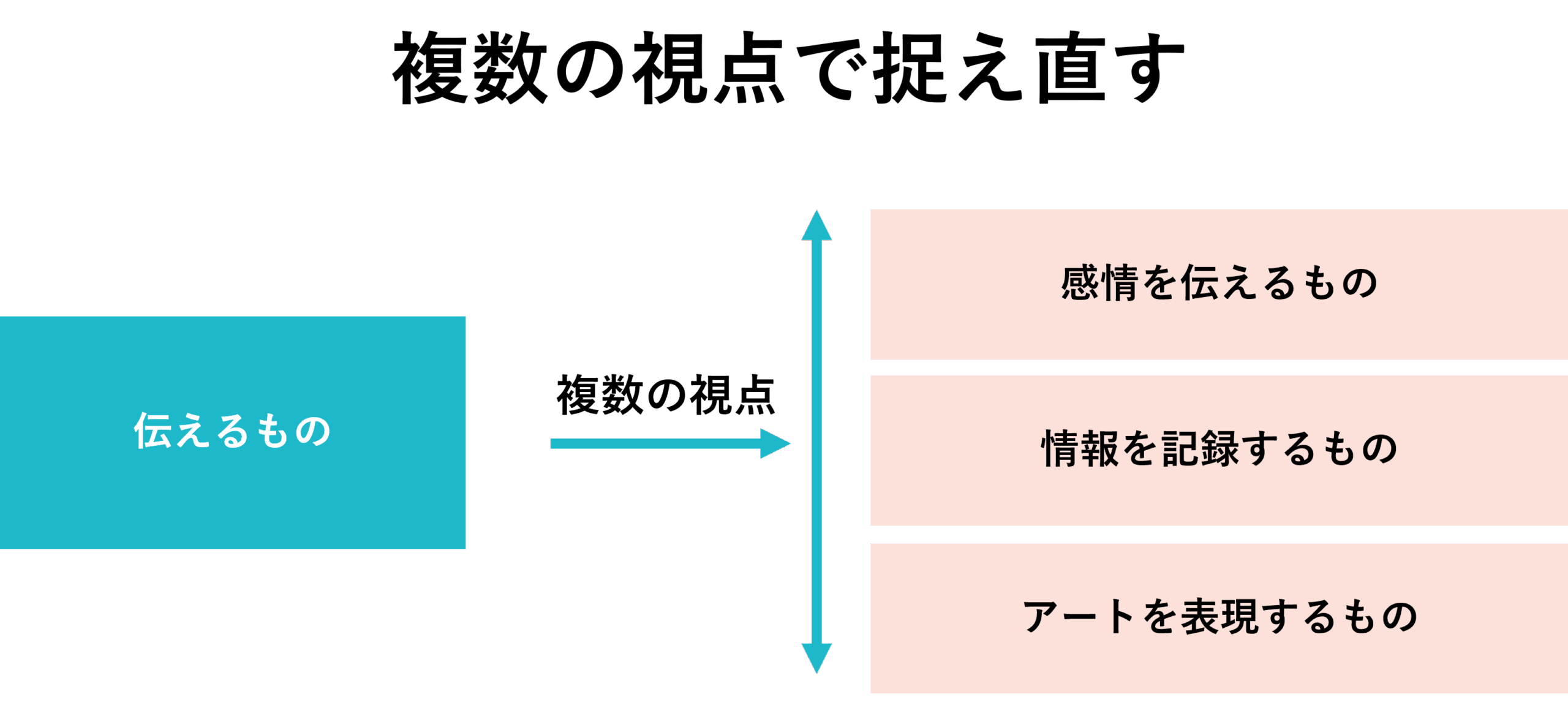 「伝えるもの」という概念も、視点を変えれば「感情を伝えるもの」「情報を記録するもの」「アートを表現するもの」といった切り口に広がります。