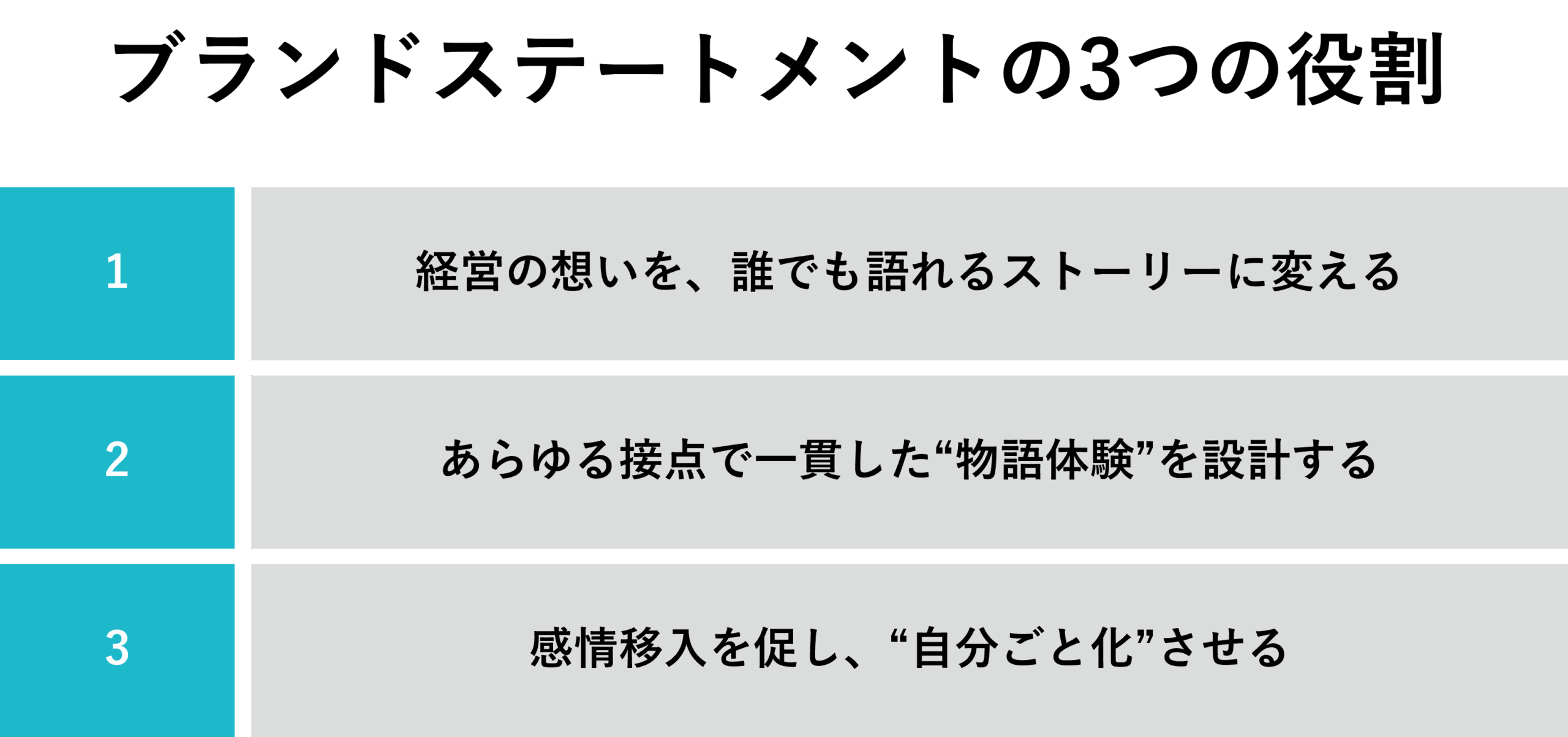 このように、ブランドステートメントはブランドの理念をストーリーとして届ける役割を担います。