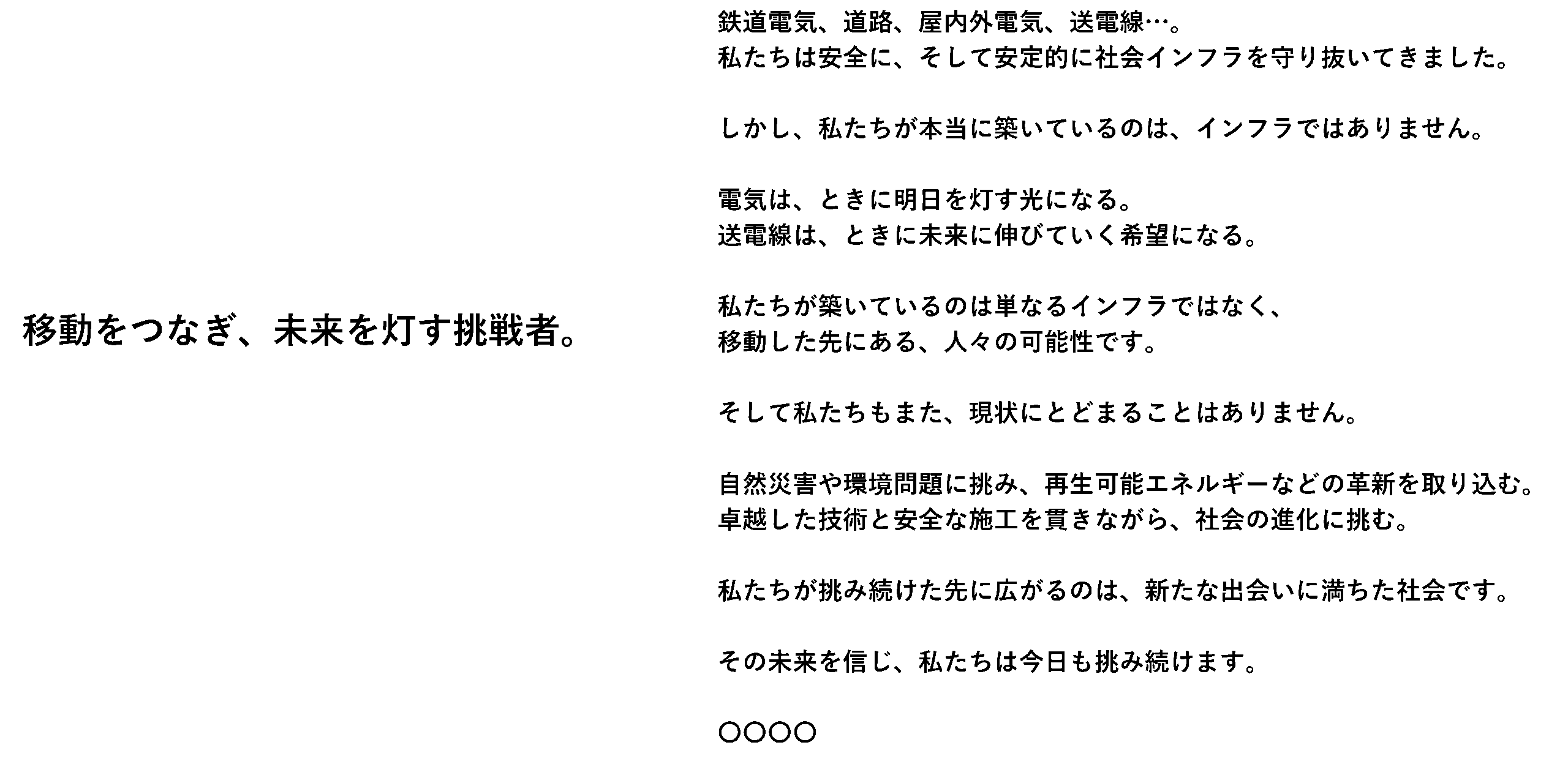 例:「挑戦者を実現に変える伴走者。」「私たちが築いているのは、インフラではなく希望です。」