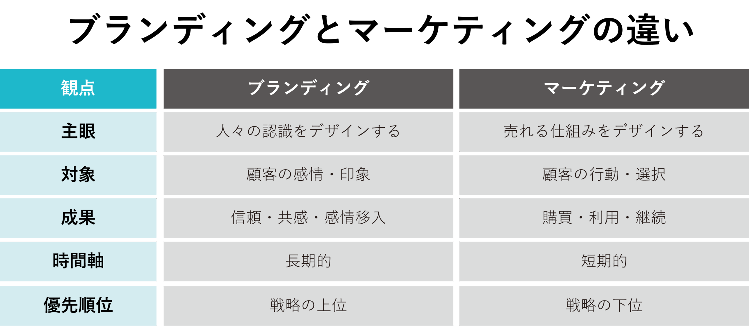 ブランディングとは、企業が「どう認識されたいか」を定義し、その認識を社会に一貫して伝えていく営みです。一方、マーケティングとは、その印象を前提に「どう売るか」「どう行動を促すか」を構築する営みです。