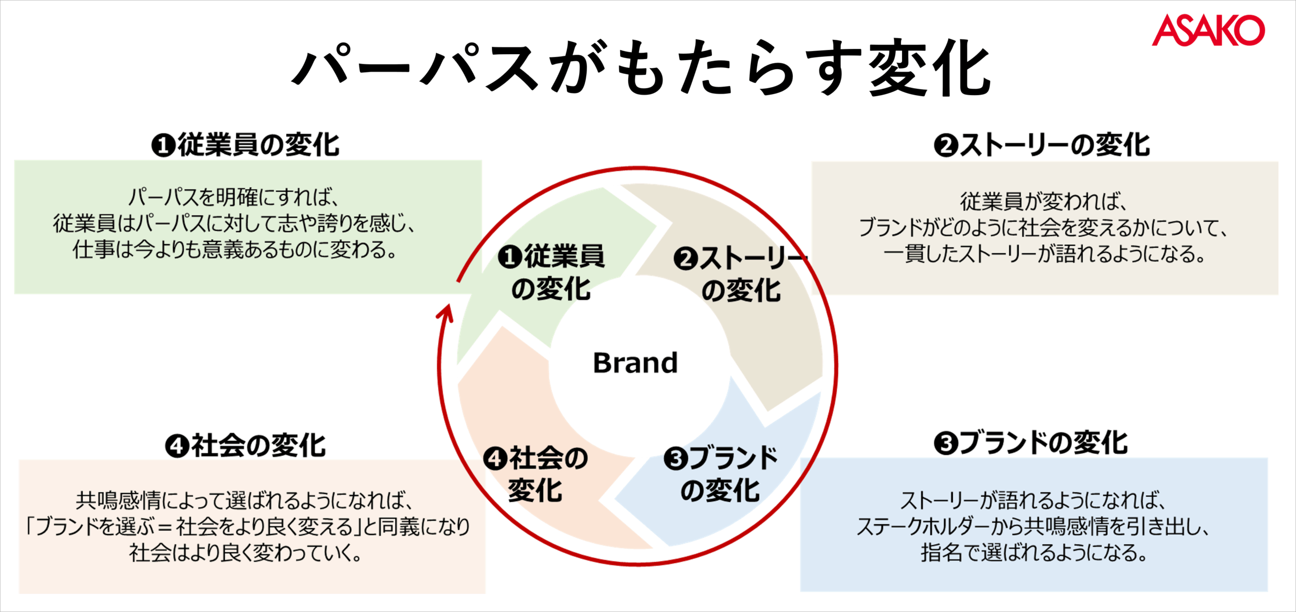 ASAKOが提唱する「Purpose Magic」は、パーパスが社内外に浸透し、行動変容と社会的共感を生み出す“好循環の仕組み”を表しています。