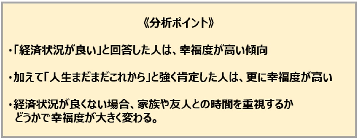 中野:すなわち今回の結果をまとめると、現在幸せと感じている⼈たちは「経済状況が良い」と感じていて、なおかつ「まだまだ⼈⽣これから」と思っている⼈たちだということが分かりました。また、経済状況が良くないと感じていても、「家族や仲間との時間が⼀番幸せ」と感じているかどうかで幸福度合いが変わることも分かりました。