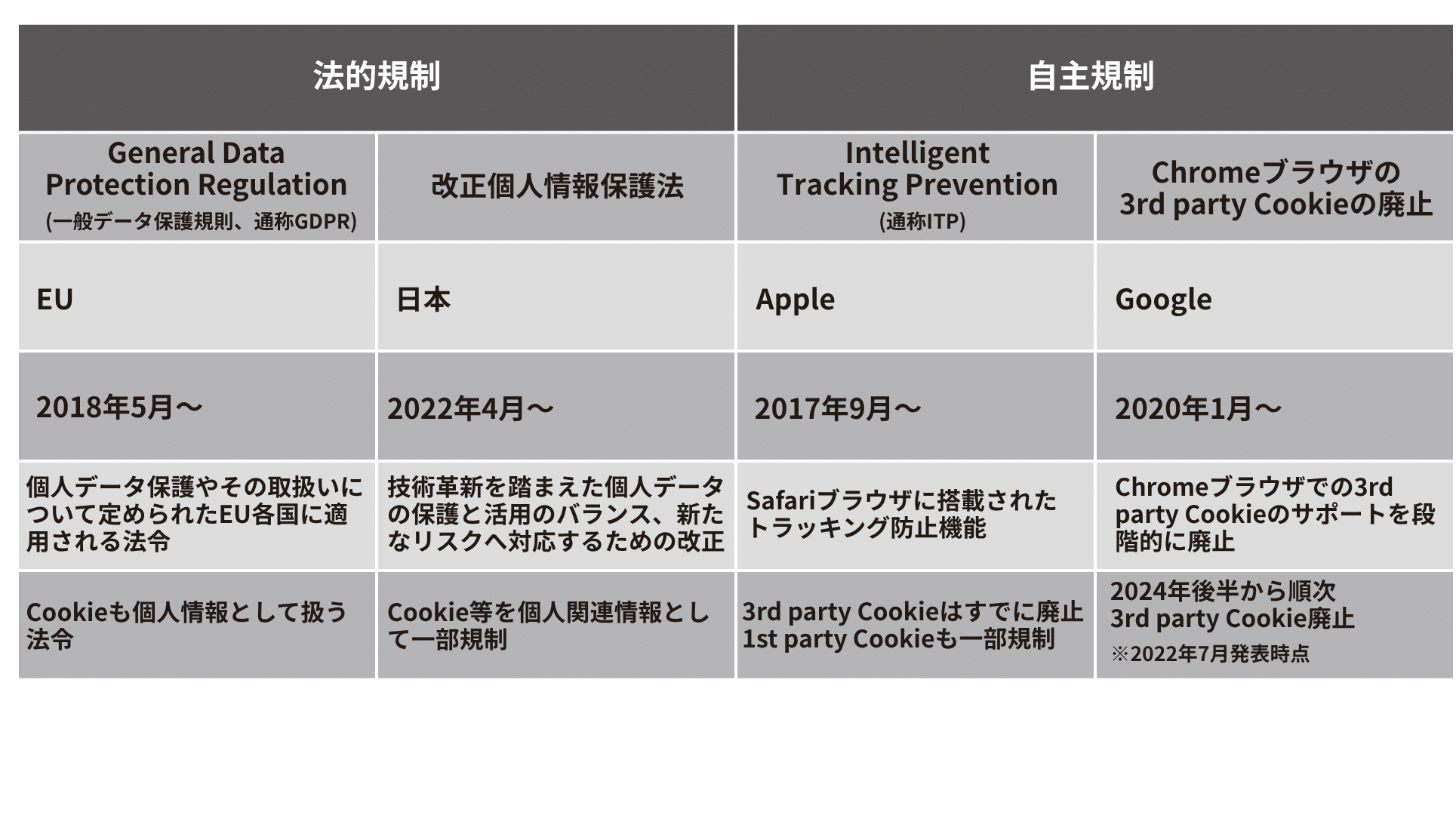GA4の導入により、ユーザー単位のローデータを取り扱うことが可能になりますが、その際に、忘れてはならないのがプライバシー保護の観点です。プライバシー保護のための規制は、プラットフォーマーによる自主規制と、国や地域による法的規制に大別されます。