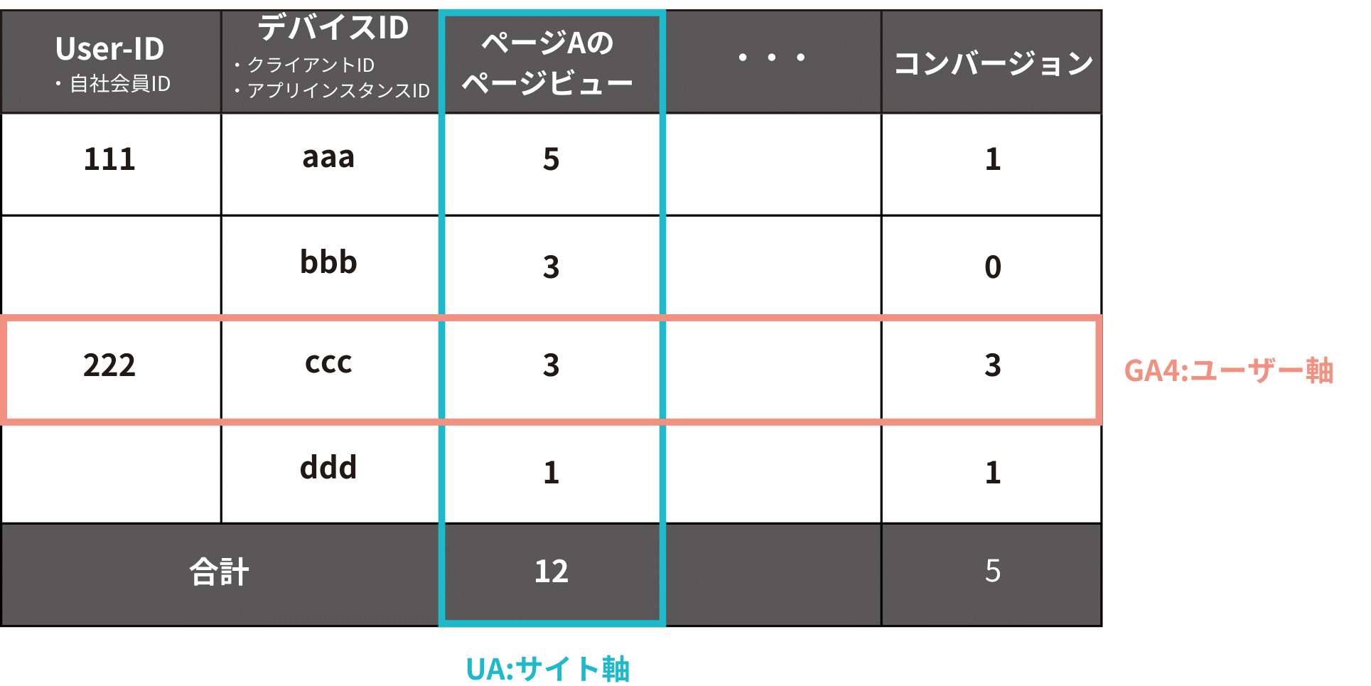 UAとGA4は、同じGoogle Analyticsでありながら、別のツールと言えるくらい多くの違いがあり、中でも、集計~分析軸の違いが最も重要であると考えています。ページやコンテンツといったサイト軸で集計~分析するUAに対して、GA4は、ユーザー軸での集計~分析といった考え方で成り立っています