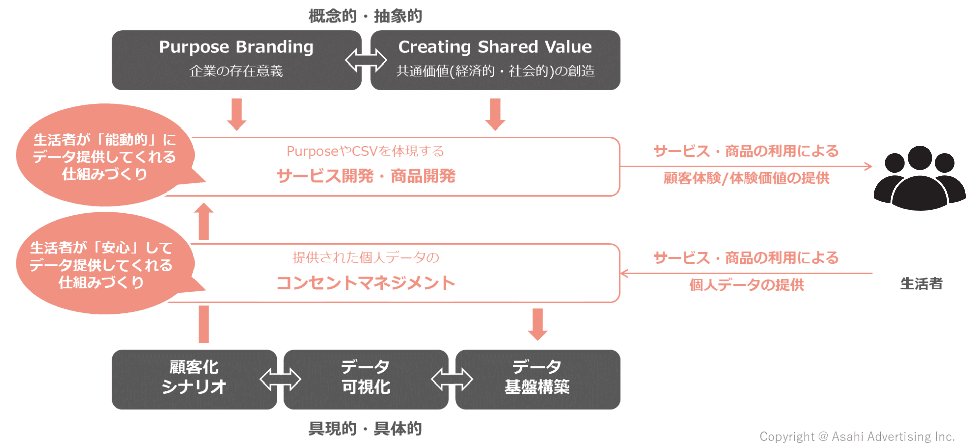 最後に取り上げるのは、GA4を起点としたデータ環境に、プライバシー保護を遵守しながら、どのように有用なデータを収集するか、といった課題です。今や、私たちのあらゆる生活シーンにデジタル技術が浸透し、これらのデジタル接点から、様々なデータを収集することが可能になりました。これらのデジタル接点を活かし、購入時のみの一地点でのデータ収集ではなく、購入前から購入後に至る顧客接点で体験価値を提供し、その対価として、生活者が自ら継続的にデータを提供してくれるような仕組みの設計~開発が重要になってきます。そこで提供する体験は、値引きやクーポン配布といった価格メリットだけではなく、パーパスやCSVといった自社の存在価値を拠り所とすることがポイントになると考えています。パーパスを「概念的・抽象的」なステートメントやメッセージに留めるのではなく、実際の接点となる「具現的・具体的」なサービス・商品にまで落とし込むことで、より強固な顧客との関係性の構築に寄与するものとなるでしょう。