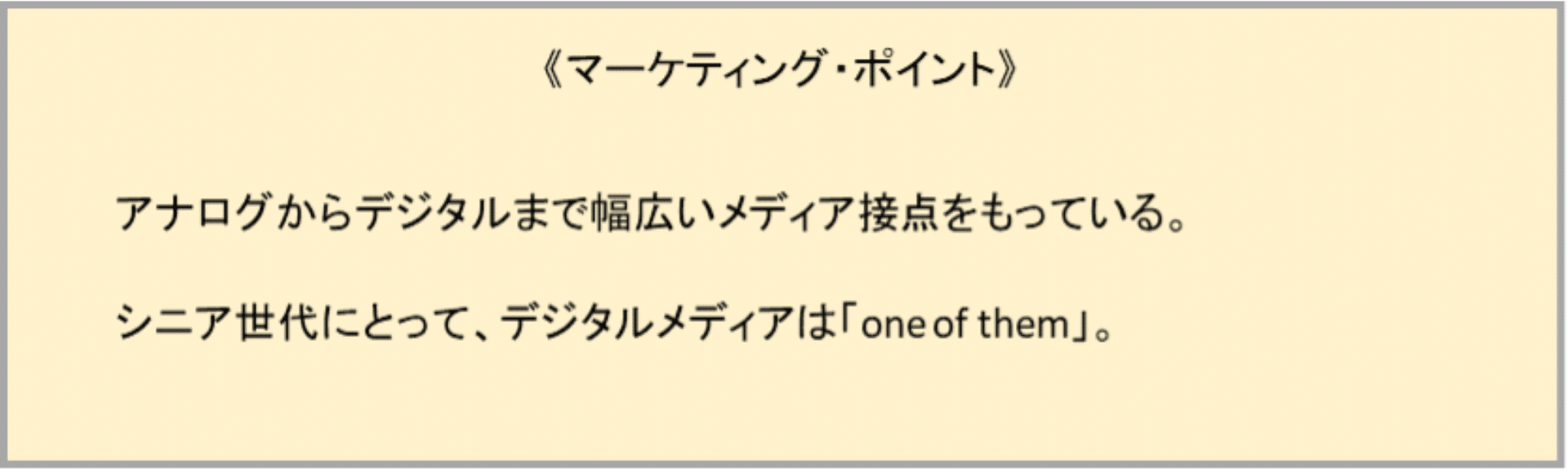 そのためシニア世代は様々なメディア接触を経てからデジタル時代に入っており、アナログなメディアから現代のデジタルメディアまで幅広く接している世代であることが特徴です。