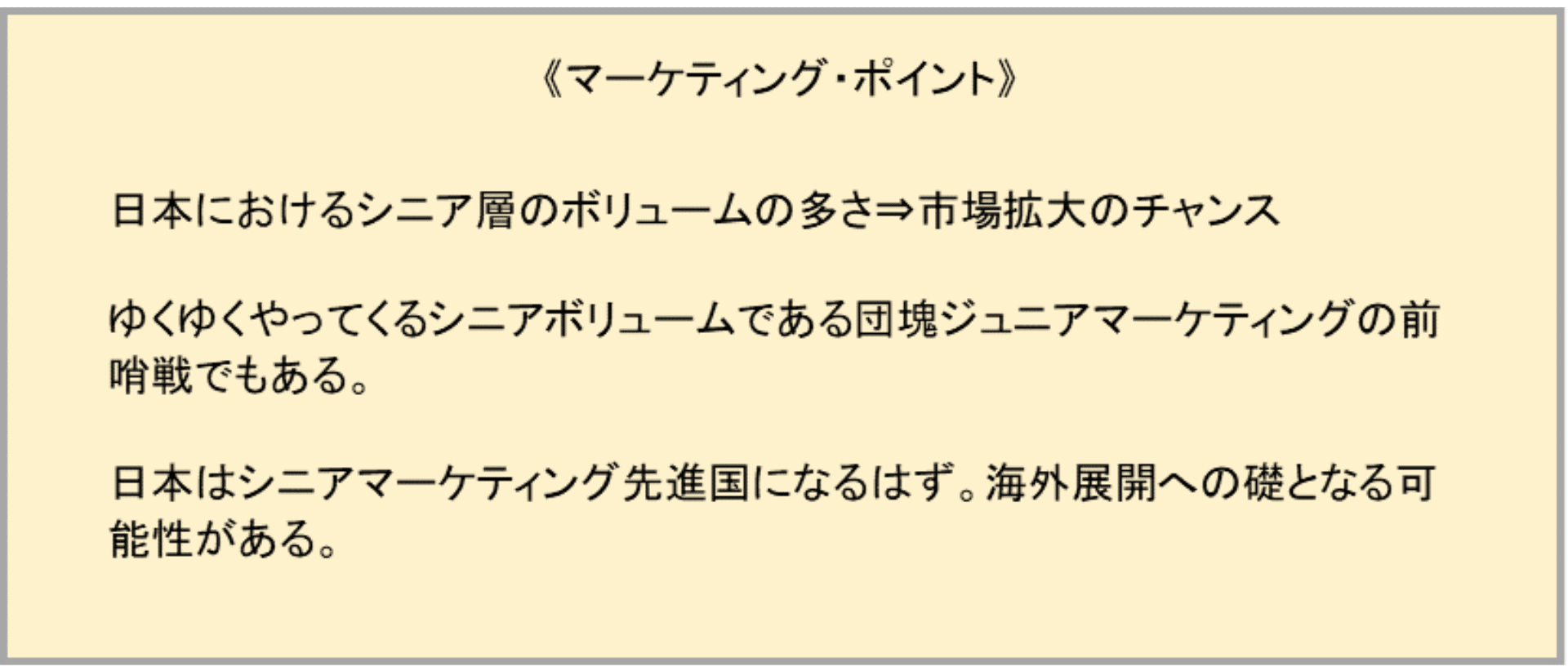 日本の高齢化が最も進んでいるということは、商品開発においてもシニアマーケティングにおいても先進国でもあるということです。この経験を活かして将来訪れるであろう海外事業における事業展開やシニアマーケティングの礎になることも考えられます。