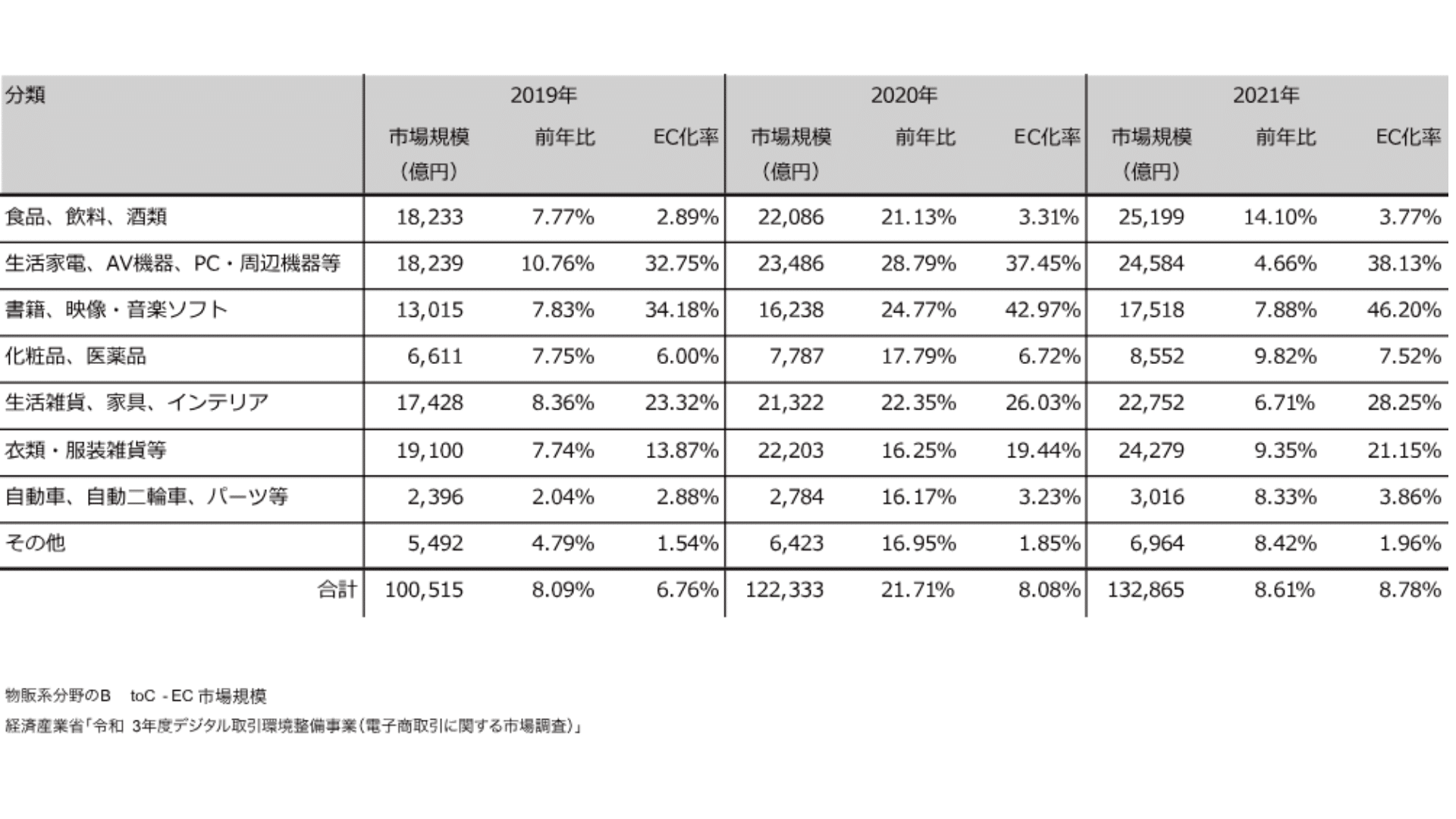 一方で「食品、飲料、酒類」や「化粧品、医薬品」のEC化率は10%にも満たない水準で、90%以上がリアル店舗での取引となっているのが実情です。つまり、一般的な食品や化粧品ジャンルの商品の販促活動はECのフィールドで展開しても売上へのインパクトは限定的であり、通常はリアル店舗をメインに施策展開することが求められます。