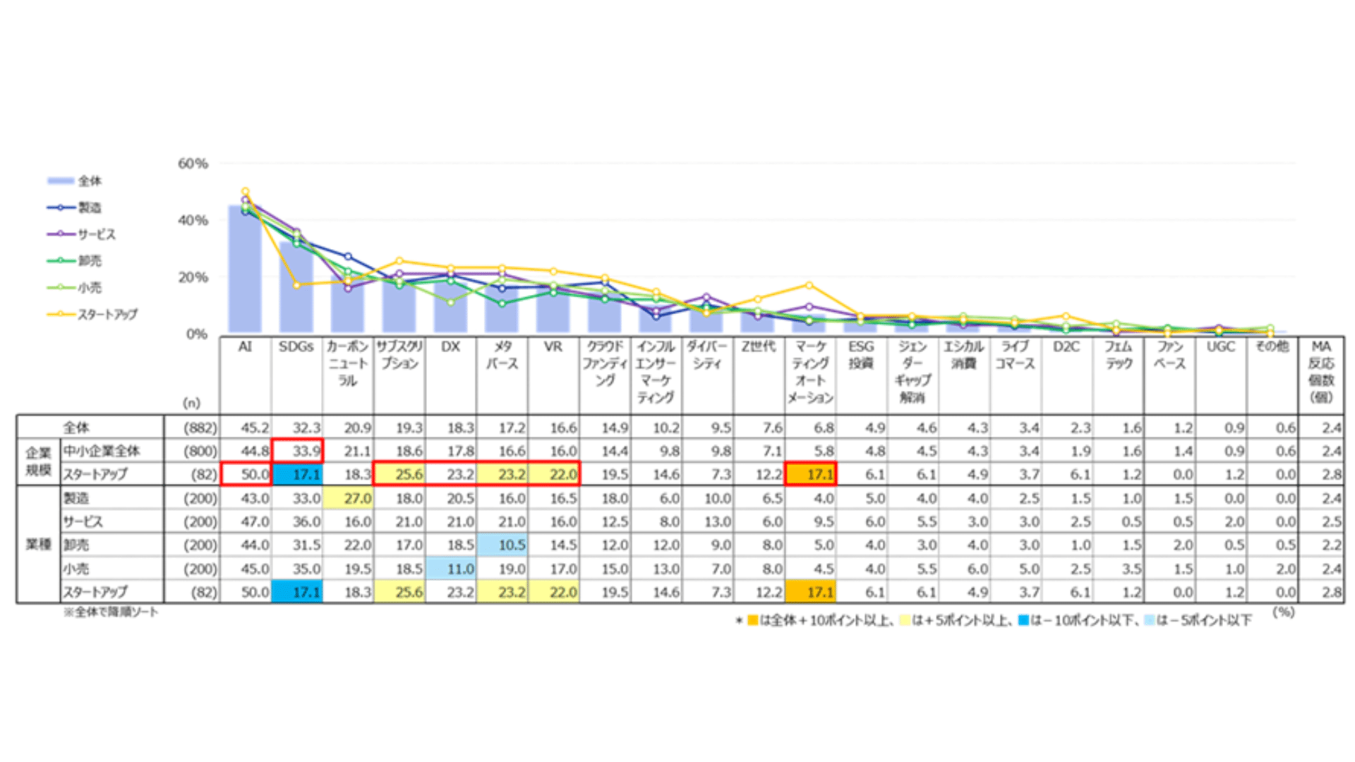 全体では「AI」が最も高く、「SDGs」「カーボンニュートラル」「サブスクリプション」「DX」が上位となりました。