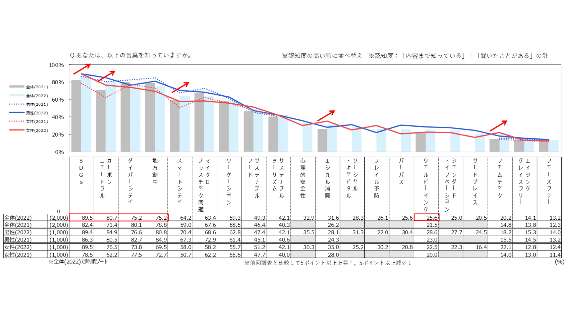 図表1は、サステナブル分野における20のキーワードの認知度を前回調査結果と比較したデータです。