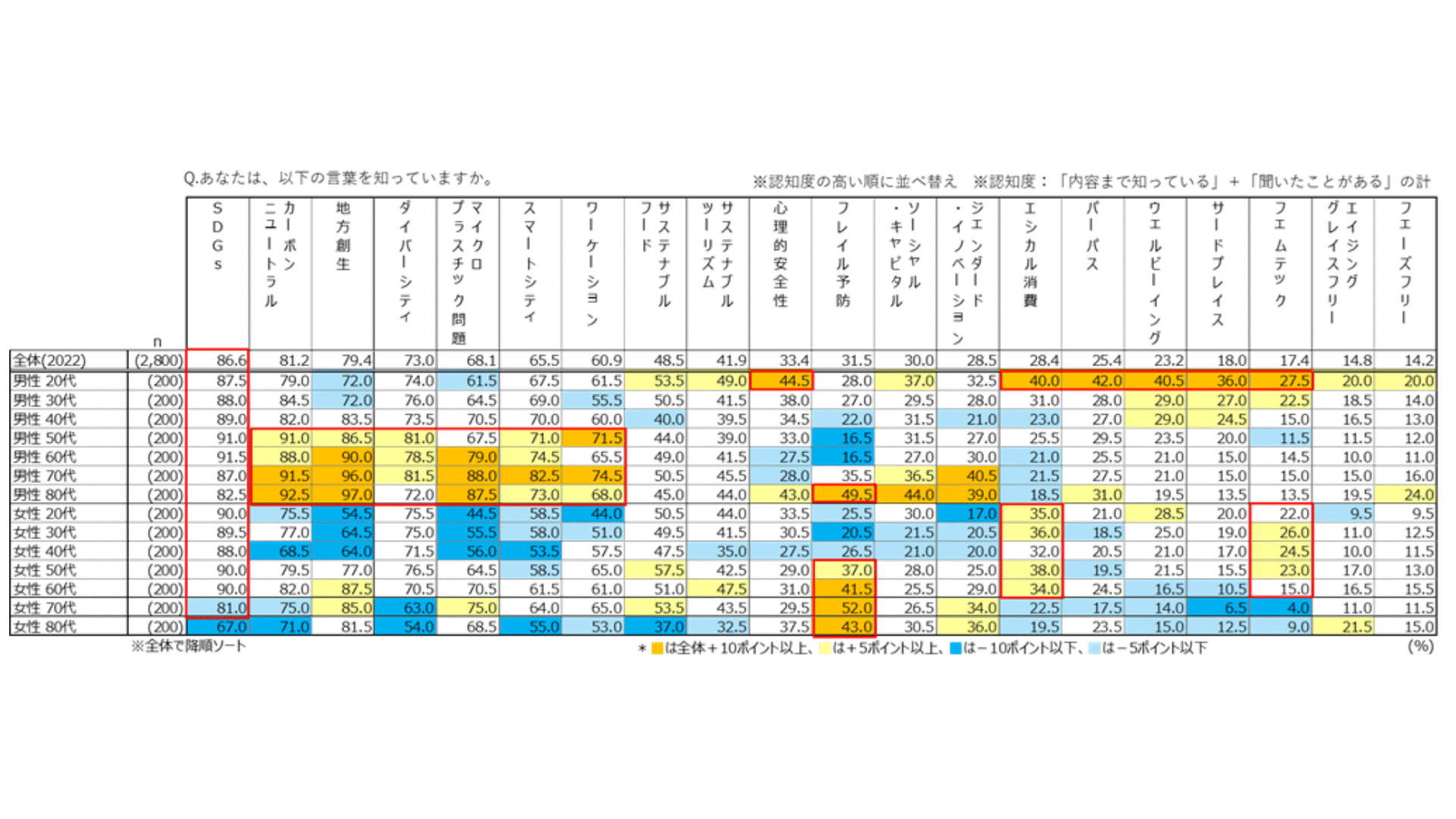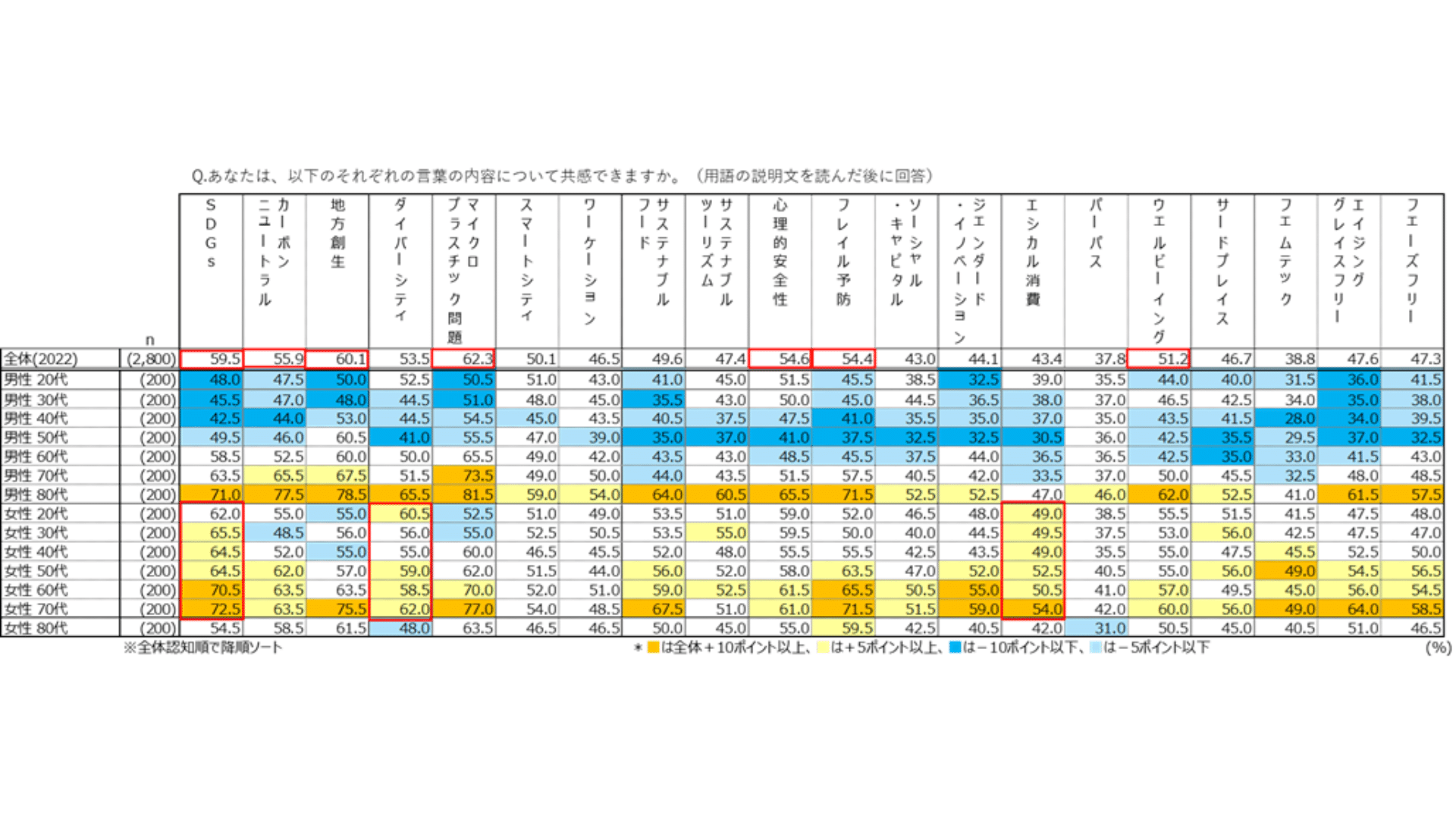 今回の記事では、20のキーワードの認知度・共感度の結果についてご紹介していきたいと思います。