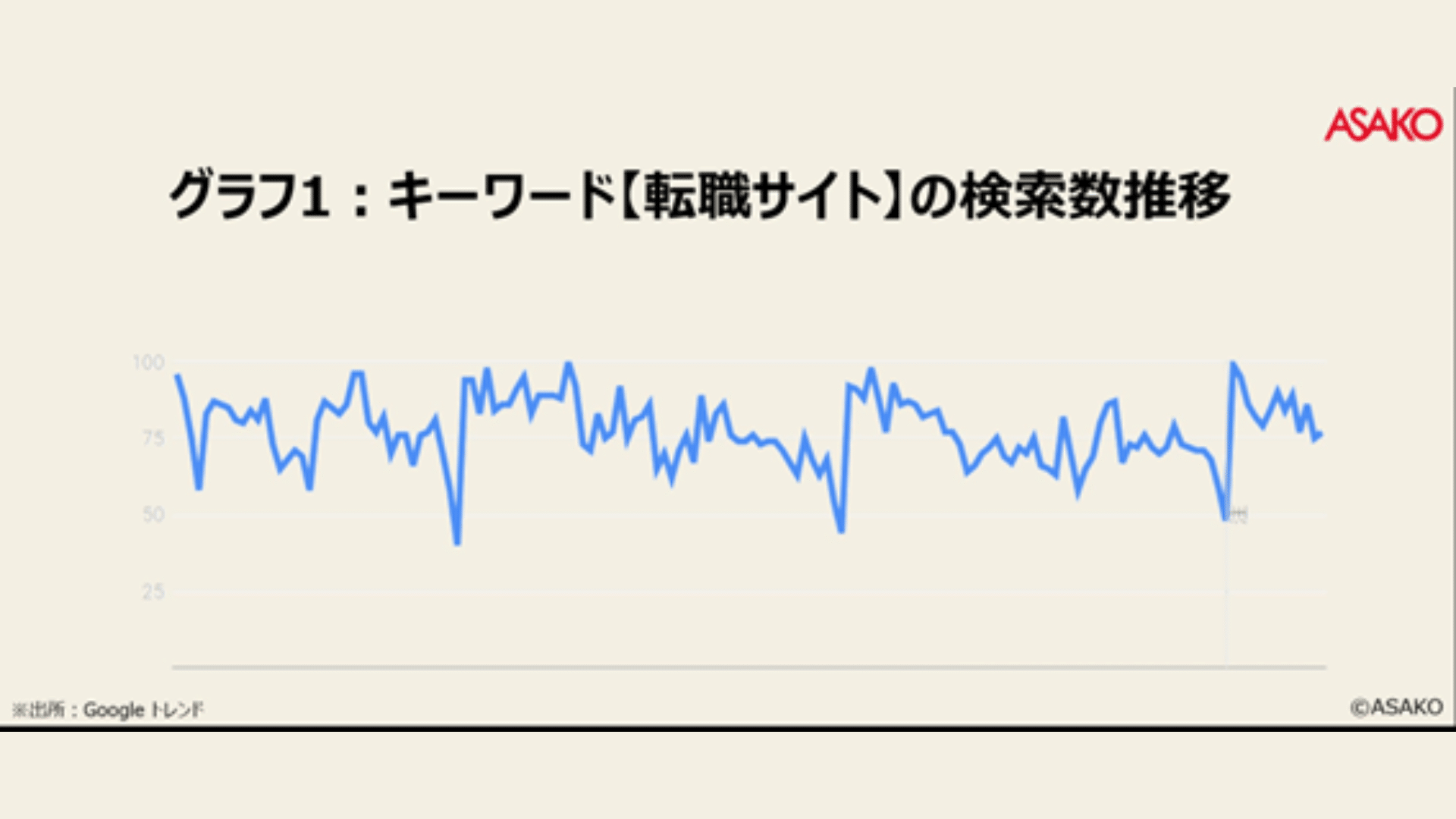 ある一定の時期を境に、【転職サイト】の検索数が大きく減少していることがわかります。こうなってしまうと「転職サイトA」のマーケティング担当者であるあなたは、かなり厳しい状況に立たされることになります。