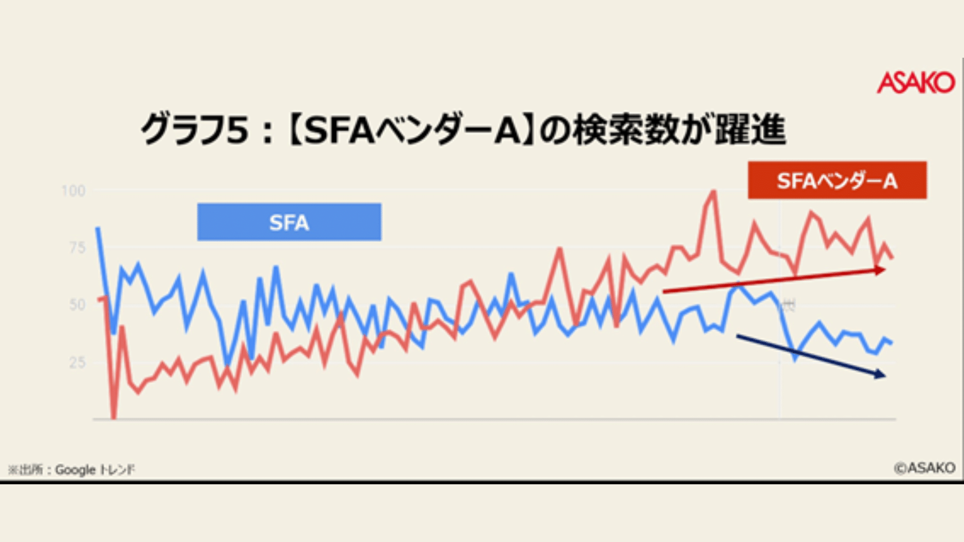 この傾向は、転職サイトだけでなく、BtoB業界でも見られます。以下のグラフ5は【SFA】と【SFAベンダーA】の検索数推移です。