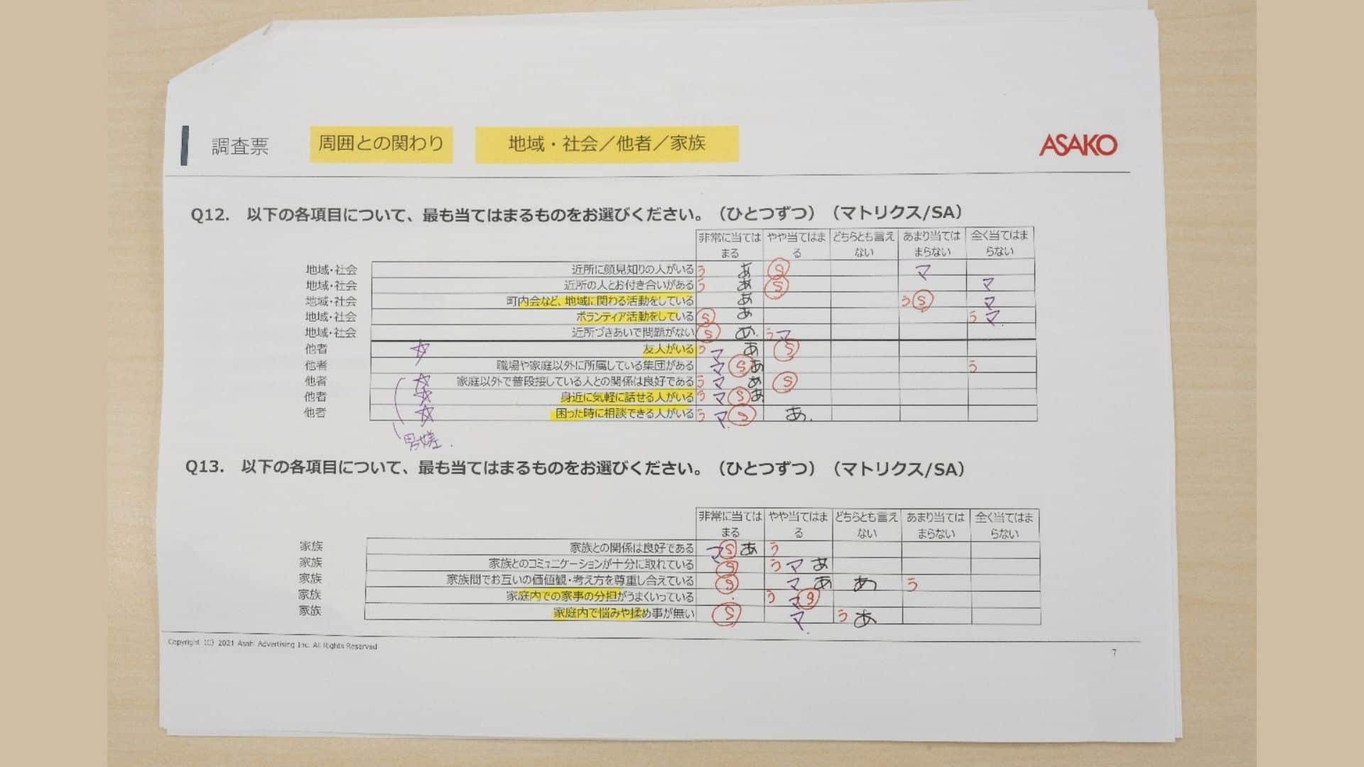 上田:なるほど、そこには地域が入ってこないんですね。確かに「他者」の指標は、一般的に男性が苦手としている部分ですが、これに関しては齊藤さんだけがパーフェクト(すべて「非常に当てはまる」を選択)。笹尾さんに関しても、「家族」についての質問は「非常に当てはまる」が多いですね。