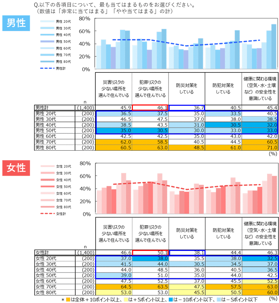 5指標の中では「犯罪リスクの少ない場所を選んで住んでいる」が、男性46.1%、女性50.1%と高くなりました。