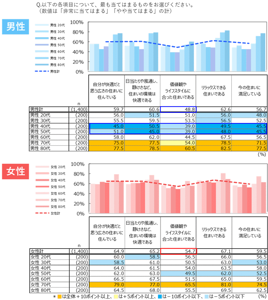 「暮らし」分野と同様、男性では70代・80代の充足度が高い一方で20代~50代の充足度が低く、とりわけ40代・50代の充足度の低さが目立つ結果となりました。女性については、5指標とも男性よりも数値が高いという結果になっています。さらに、「価値観やライフスタイルに合った住まいである」は男性48.8%、女性54.7%と約6ポイントの差がついており、男女で同居する場合、住まい選びの面で女性の条件や好みが優先され、男性の不満がたまっているかもしれません。