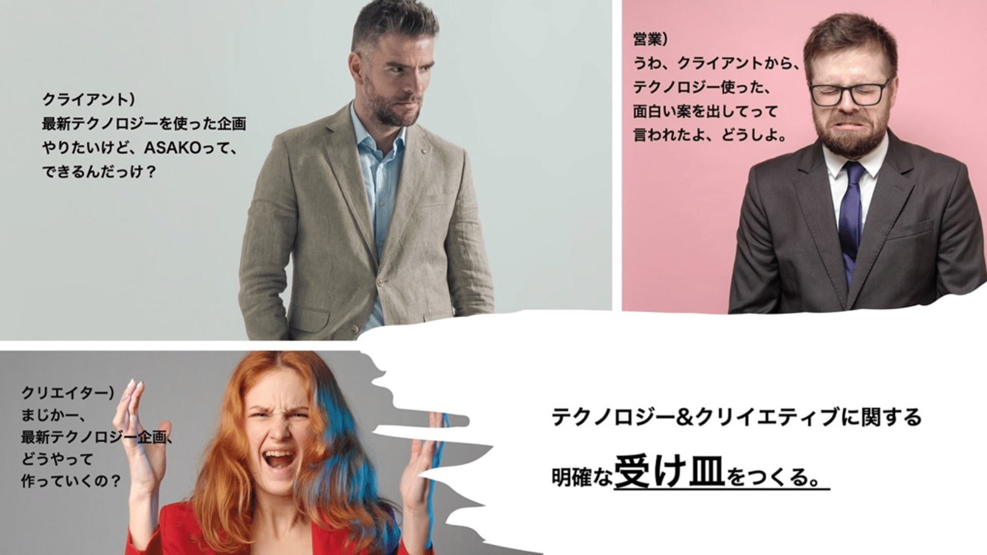 ASAKOにも、テクノロジーを活用したアウトプットの依頼や実績はあるのですが、境界が不明瞭なため、クリエイティブ部で対応していたり、セールスプロモーション部で対応していたりと、業務の依頼先が分散していました。