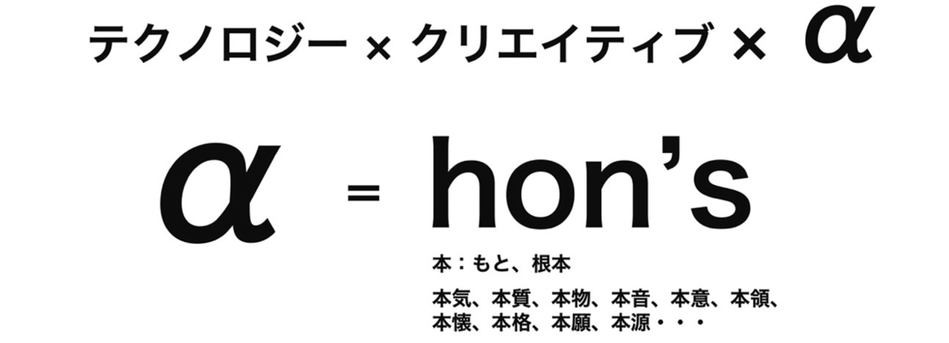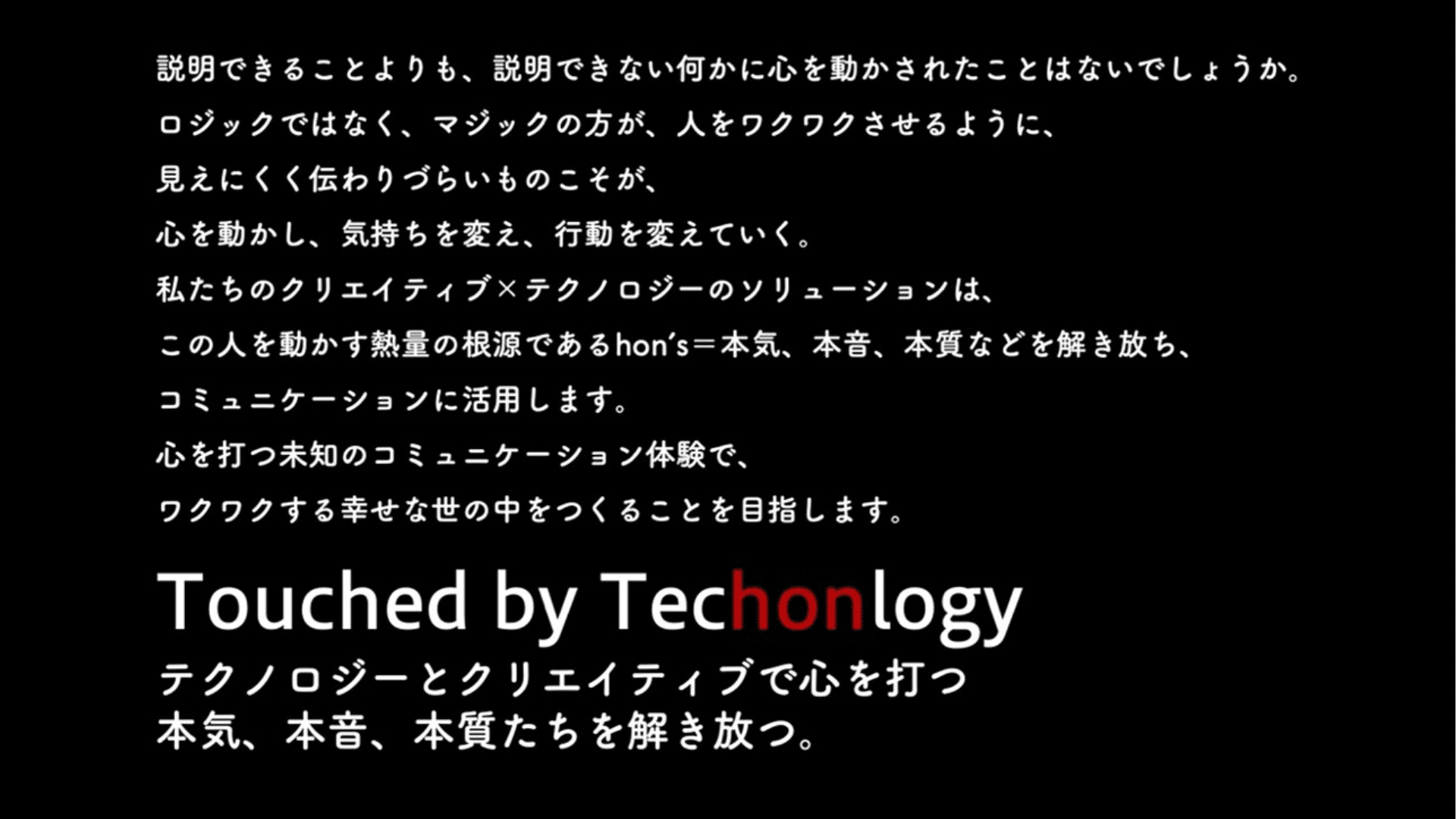 ちなみに、説明するのは野暮な気もしますが、ステートメント内にあるTechonlogyの「hon」は、テクノロジーによって、hon’sを解放していくことを表現した、あえての間違いですので、あらかじめご了承ください。読み方は、「テクノロジー」としています。