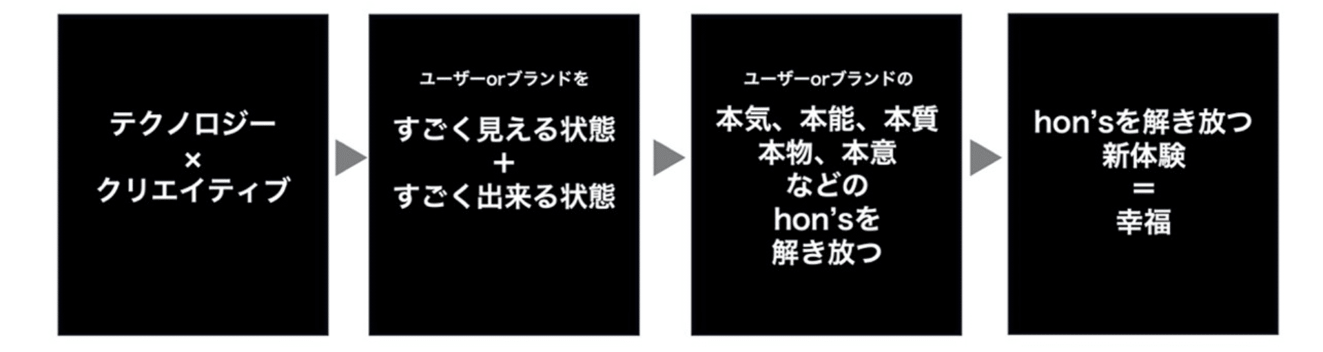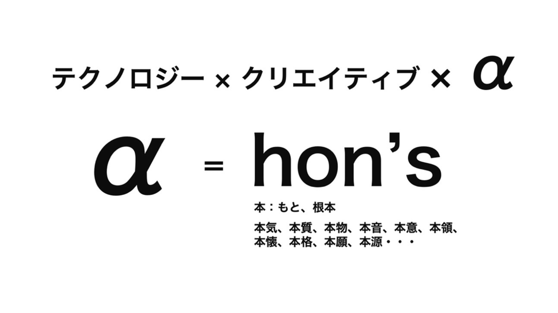 ちなみに、説明するのは野暮な気もしますが、ステートメント内にあるTechonlogyの「hon」は、テクノロジーによって、hon’sを解放していくことを表現した、あえての間違いですので、あらかじめご了承ください。読み方は、「テクノロジー」としています。