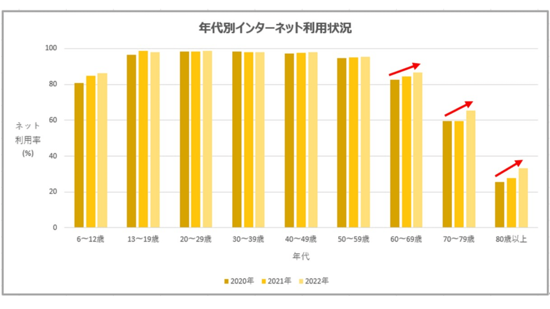 実際に、総務省が実施した*1「令和4年通信利用動向調査の結果」を見ると、2020年から、シニア層(60歳以上)のインターネット利用率は右肩上がりに上昇しています。