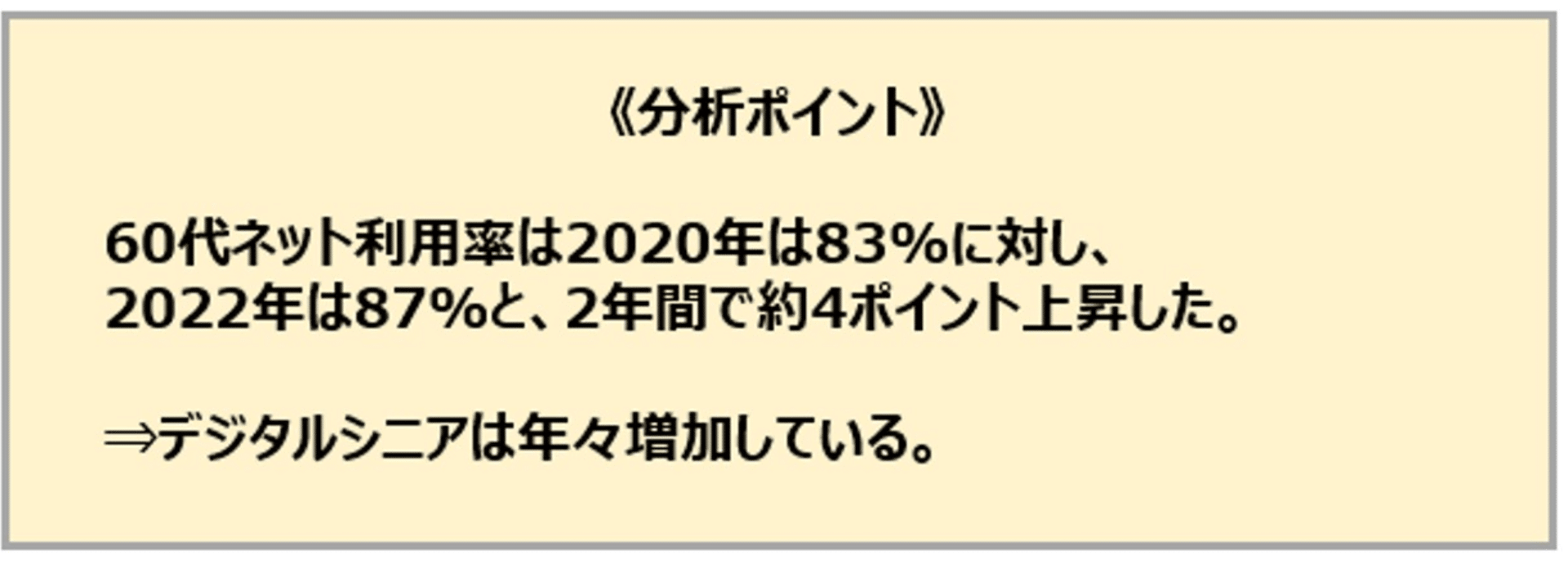 桐山:2020年の60代ネット利用率は83%ですが、2年で約4ポイント上昇していて、シニアのデジタル化が進んでいることが分かりますね。そして今後もシニアのデジタル化は加速していくことが予想されます。