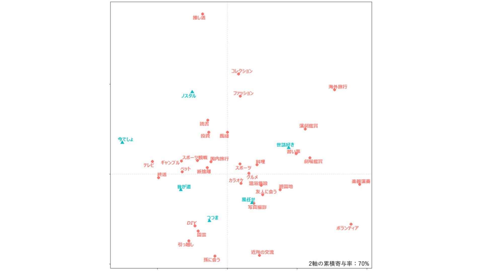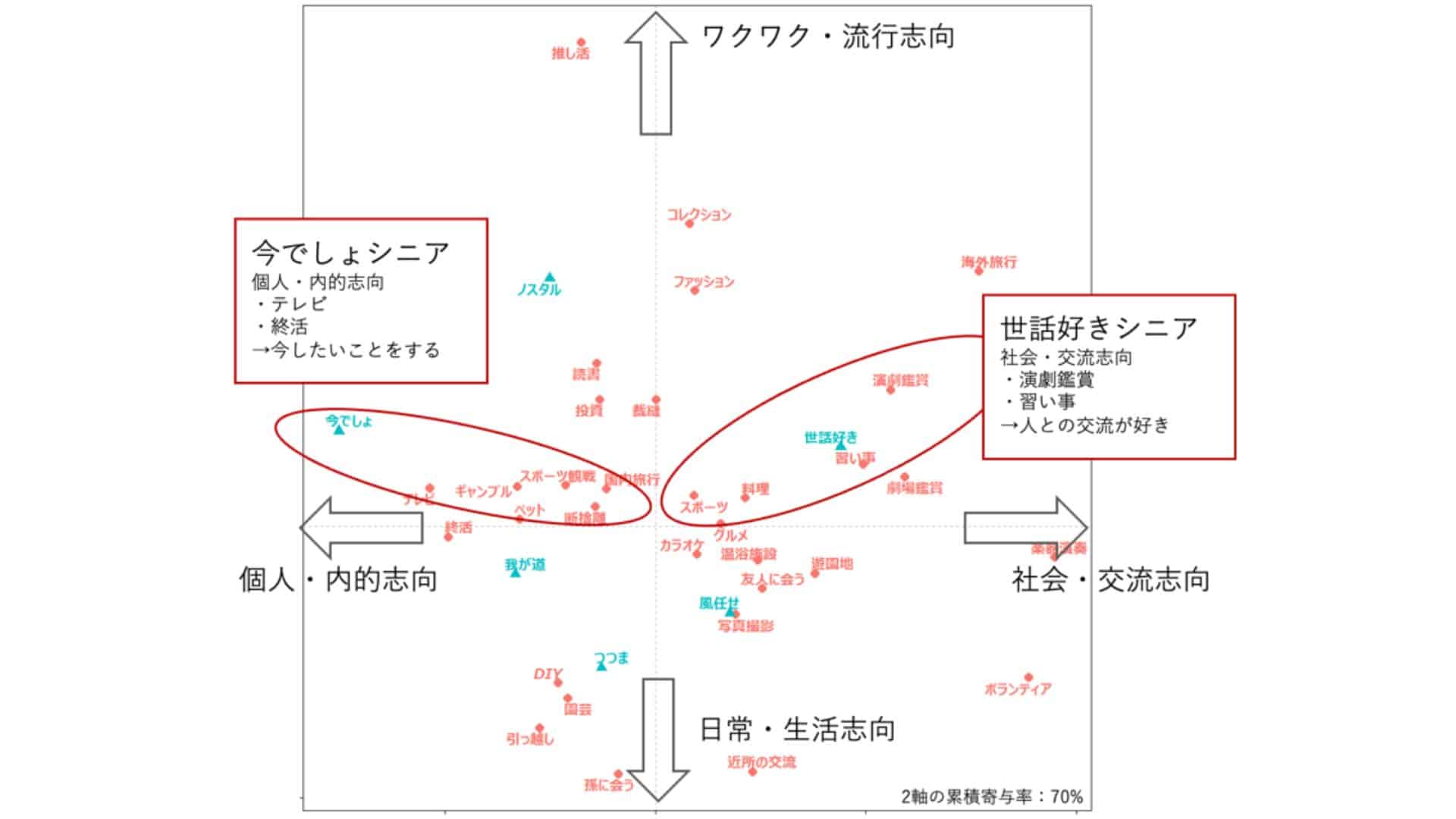 中野:こちらは縦軸と横軸が何を意味しているのかを解釈したものです。横軸で最も左に配置されたプロットは「テレビ」「ペット」「終活」であり、最も右に配置されたプロットが「ボランティア」「海外旅行」「楽器演奏」であることが確認できます。この傾向から、横軸の左側は「個人的な趣味」を示し、右側は「集団・交流的な趣味」を示していると解釈できます。なんとなく、左にあるものは個人で黙々と行う活動、右は外に出て社会的な交流をするものが多い気がしませんか?