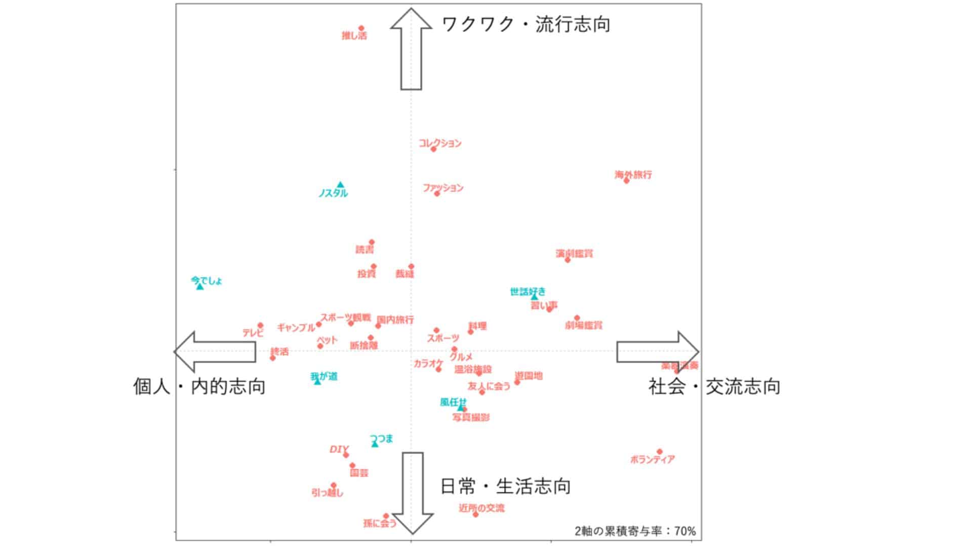 中野:こちらは難しいところですが、下の方には生活基盤や日常に根差した行動(園芸、引っ越し、近所の交流など)が多く、地に足がついた感じがします。一方、上の方は流行や趣味色の濃い行動(推し活、コレクション、ファッションなど)があり、ワクワクする、嗜好性が強めな趣味な気がしますね。これに沿って縦軸に「日常・生活志向」、「ワクワク・流行志向」とラベルをつけました。
