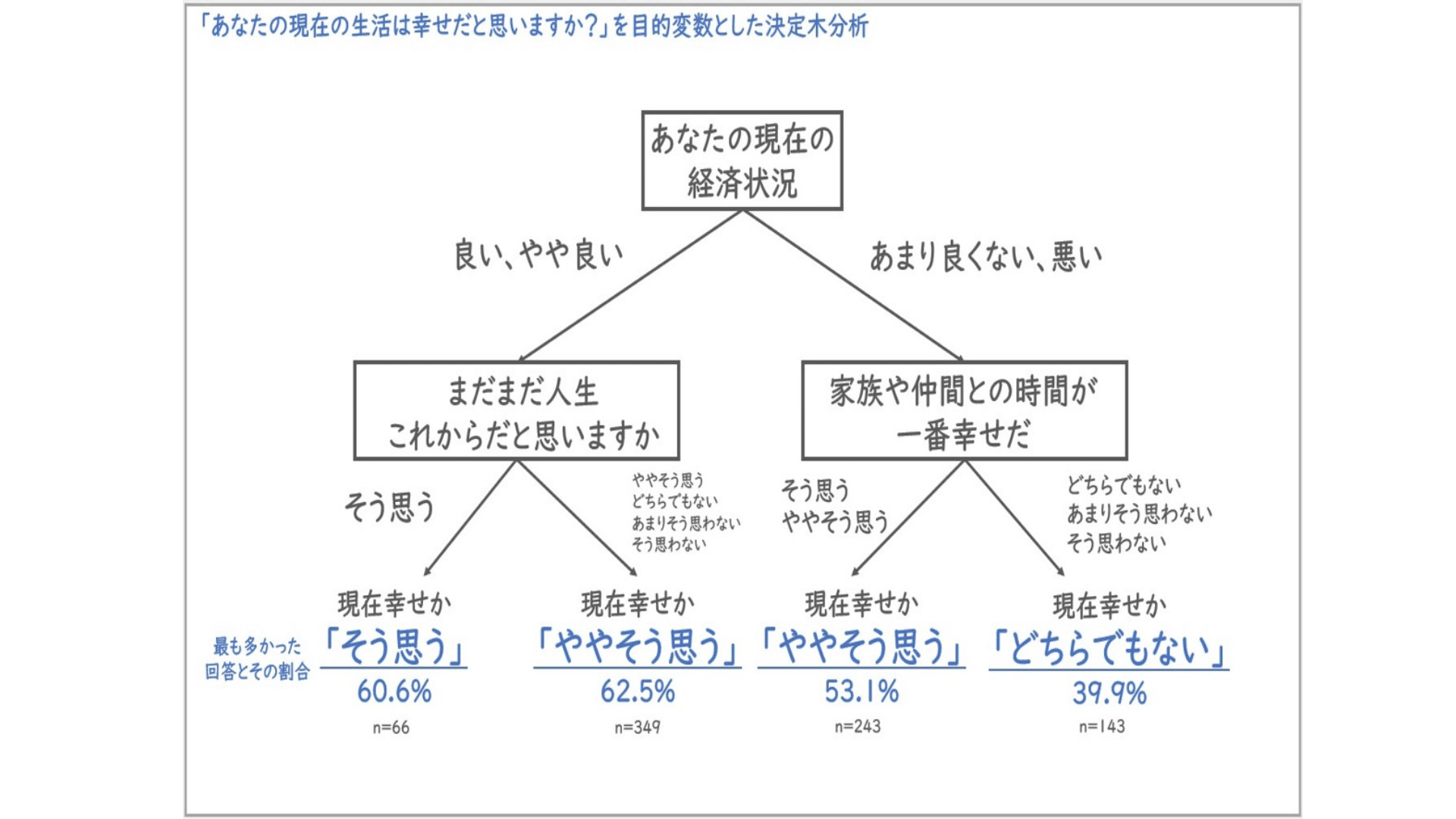 中野:そうですね(笑)。ただ決定⽊分析の注意点として、「因果関係を⽰しているわけではない」ということがあります。 つまり今回は「経済状況が良いと回答したグループは幸福度合いも⾼いグループだった」ということは分かりますが、「経済状況が良くなれば幸せになれる」かどうかは分かりません。もしかしたら「幸せと回答する⼈は楽観的なので、いくら経済状況が悪くても、それを悪いと感じない」というケースもあるかもしれません。
