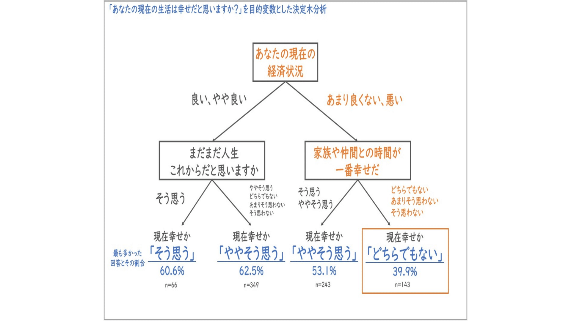 中野:はい。また、決定⽊分析は解釈はしやすい一方、それほど精度の良い分析ではないので、その点も注意が必要です。あくまで今回の調査対象者においては、「経済状況の良さ」、「これからの⼈⽣への前向きさ」、「家族や友⼈との時間」の3点が現在の幸福度合いに影響している可能性がある、と⼤きく捉えるくらいがちょうどいいと考えられます。