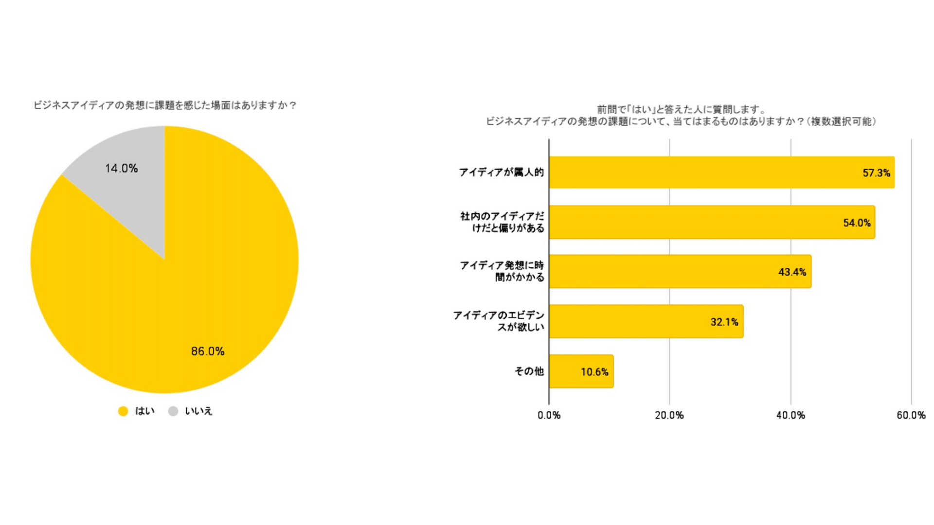 ある調査によると、新規事業担当者の86%がビジネスアイディアの発想に課題を感じていると回答しています。その主な原因は「アイディアが属人的」「社内のアイディアだけだと偏りがある」「アイディア発想に時間がかかる」など。